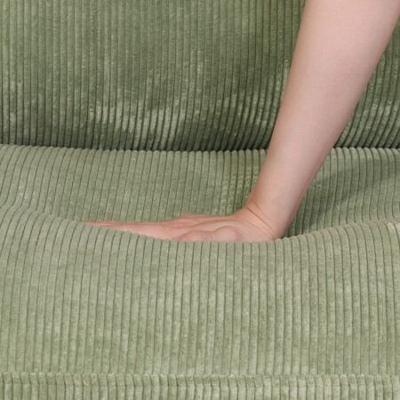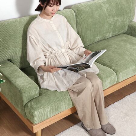 手触り柔らかなコーデュロイ生地で、ずっと座っていたい心地よさが自慢です。座面はポケットコイルを使用し、体をしっかり支えてくれます。また、背はシリコンフィルを使用し、包み込むような柔らかさです。肘掛けは高さが低いので、お部屋の圧迫感を軽減してくれます。座面下は15cmあり、ソファの下は柄の長い掃除用品やロボット掃除機も通れます。埃が溜まりやすいソファの下を綺麗に保つことができます。