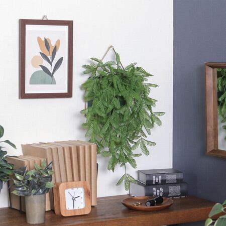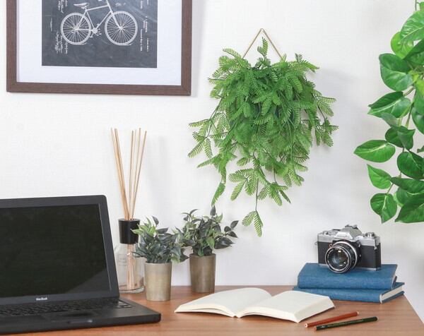 吊るしたり引っ掛けて使用するハンギングタイプは場所を取らず、お子様やペットのいたずらも防げます。ポットはグリーンと同色にし、ハンガー部分をゴールドにすることで上質感を演出し品のある仕上がりに。フェイクグリーンなので水やりなどの手入れを気にすることなく楽しめます。ときどき乾いたタオルでホコリをはたくだけでOK!リビング・寝室・玄関などどこでもお好きな場所でお使いいただけます。