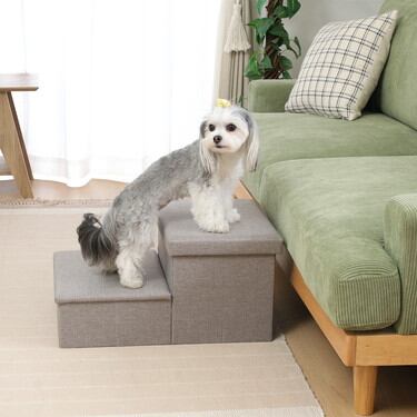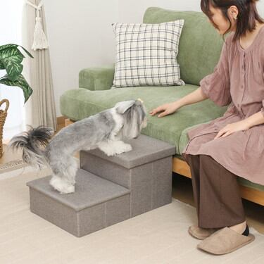 一見ペットハウスには見えないデザインと落ち着いたカラーで自然とお部屋に馴染みます。ソファやベッドなど自分の体格の2~3倍の高さを上り下りするペットの身体への負担を軽減するためのステップです。ソファの座面高は通常38~42cmほどあるのジャンプも大変!2段ステップになっているので、楽にソファへ移動できます。ステップは程よい柔らかさなので、ペットが乗り降りする際の衝撃も緩和します。ステップの中にはペットの洋服やおもちゃなどをしまうことができ、スペースを有効活用できます。開いた本体に底板とクッションを入れて蓋(座面)をのせるだけ!使わない時はステップ部分もきれい折りたため、厚さ8cmまでコンパクトに!