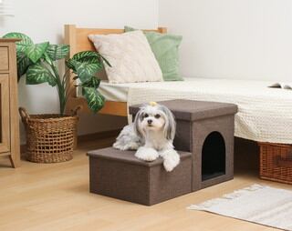 一見ペットハウスには見えないデザインと落ち着いたカラーで自然とお部屋に馴染みます。ソファやベッドなど自分の体格の2~3倍の高さを上り下りするペットの身体への負担を軽減するためのステップです。広すぎない入口で中の温められた空気をキープ。ロータイプなので、負担なく出入りできます。高さの低い箱の中にはマジックテープ付きの仕切りもついているので、ペットグッズをスッキリ収納することができます。ハウス内のクッションには、ポリエステルボアを使用。やわらかい質感でペットが快適にくつろげます。開いた本体に底板とクッションを入れて蓋(座面)をのせるだけ!使わない時はステップ部分もきれい折りたため、厚さ10cmまでコンパクトに!