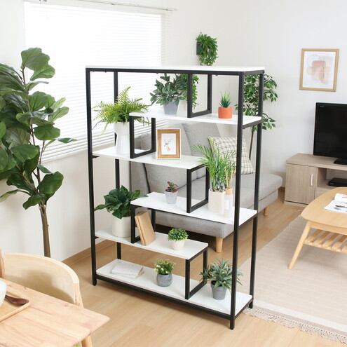 小型の観葉植物などをよりおしゃれに楽しむことができるディスプレイラックです。スタイリッシュなホワイト×ブラックスチールの組み合わせ。また、オープンラックなので圧迫感を感じさせません。通常のシェルフと異なり、棚の位置が独特な形でインテリア性も高く、一気におしゃれな空間に。ディスプレイスペースが多いため、あれもこれもと欲張った使い方が可能です。裏表がないデザインなので、お部屋の間仕切りに使用することもできます。熱や傷、汚れに強いメラミンシートを使用。お手入れも簡単です。