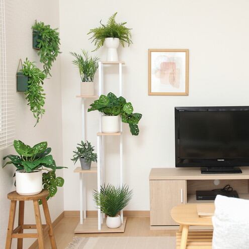 お花や小型の観葉植物などよりおしゃれに楽しむことができるディスプレイラックです。植物と相性のいいスチール×木目のデザインで、インテリアによく馴染みます。幅40×奥行40cmのスリムサイズなので、コーナーなどの狭いスペースも有効活用できます。天板は19×19cmと大きいので、小さな多肉植物を複数置いたり小物を追加したり、飾り方は自由自在。グリーンだけでなく、写真立てやお気に入りの雑貨を飾るなど使い方は様々。天板には傷や汚れに強いと云われているメラミンシートを使用。汚れてもサッと拭くだけでお手入れ簡単です。7.2kgと軽いため、お掃除の時も1人でサッと動かすことができます。