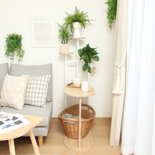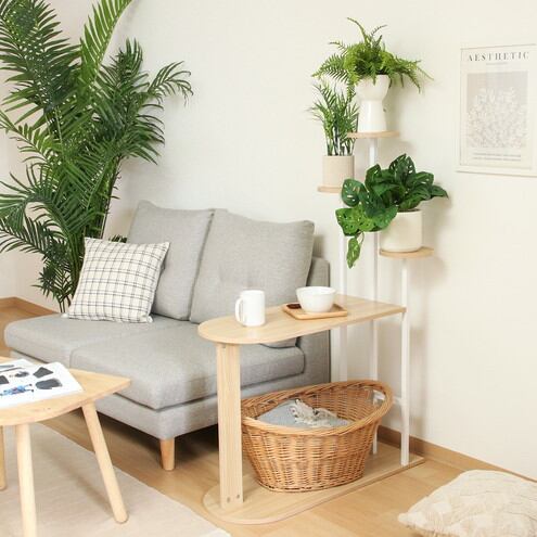 お花や小型の観葉植物をよりおしゃれに楽しむことができるディスプレイラックです。植物と相性のいいスチール×木目のデザインで、インテリアによく馴染みます。奥行33cmのスリムサイズなので、コーナーなどの狭いスペースも有効活用できます。たっぷり物が置ける天板スペースでティータイムやデスクワークも快適です。グリーンだけでなく、写真立てやお気に入りの雑貨を飾るなど使い方は様々。裏表がないデザインなので、お部屋の間仕切りに使用することもできます。天板には傷や汚れに強いと云われているメラミンシートを使用。汚れてもサッと拭くだけでお手入れ簡単です。