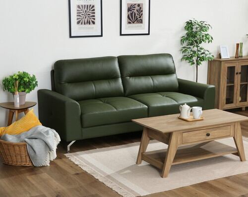 渋めのカラーリングとボリューミーな見た目がお部屋に重厚感を持たせます。座面は幅154×奥行53cmでゆったりとしており、胡坐をかくこともできる快適な広さです。ウェービングベルトとウレタンフォームでしっかりとホールド。座面も同様に沈み込み過ぎないほど良い弾力で快適な座り心地です。ゆったり体を預けられるひじ掛けは寝転んだときの枕代わりにもなります。ソリッドなデザインのスチール脚でスッキリとスタイリッシュな印象を与えてくれます。牛皮と合成皮革を合わせた張り材を使用しているため、水が染み込みにくく安心してご使用いただけます。