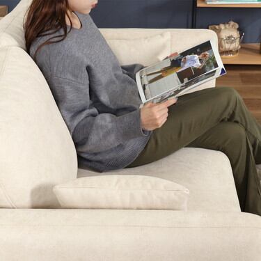 ボリュームのあるデザインですが、ブラックスチールの細い脚が引き締まった印象に見せてくれます。張り材は国内メーカーとの共同開発で実現した抗菌仕様。引っかき傷に強い素材と滑らかな肌触りが特徴です。座面は幅70×奥行110cmの2人掛けサイズ。あぐらをかいたり、深く腰掛けたりと自由にリラックスできます。腕をゆったり預けてリラックス。横向きではしっかり背もたれに。クッションも2個付属していて快適にお使いいただけます。ポケットコイルが入った座面はしっかりとした座り心地で、シリコンフィル入りの背もたれは柔らかく腰当たりの良いソファです。ソファの下は柄の長い掃除用品やロボット掃除機も通れます。埃が溜まりやすいソファの下を綺麗に保つことができます。