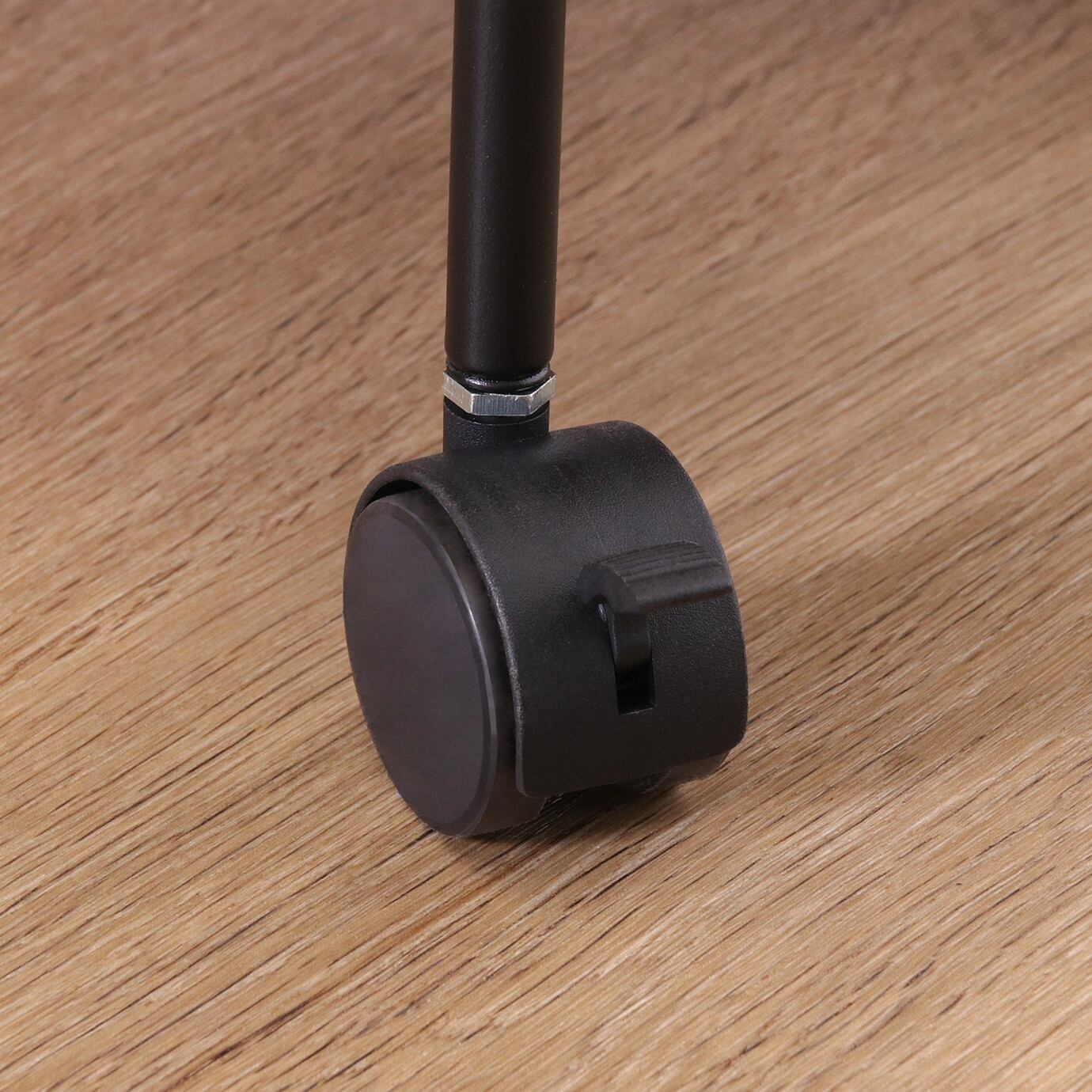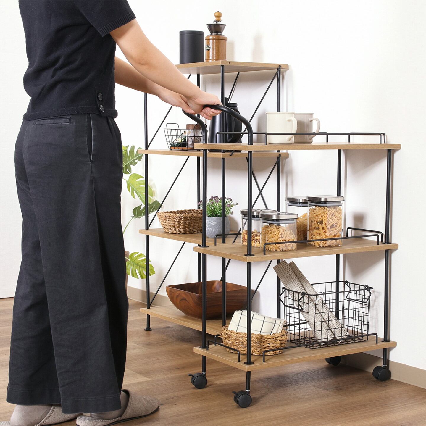 板の穴にワイヤーフレームを差し込みねじ込むだけで完成する「ツイストロックシステム」を採用したシリーズで、手軽におしゃれなインテリアを楽しめます。キャスター付きなので移動はらくらく。キッチン回りやダイニングの横など、使いたい場所に移動できます。幅67×奥行29.6cmの天板は、フラットな作りなので、ちょっとした作業台として使えます。収納棚の高さは31cmで、サイドに落下防止のワイヤーもついており、使い勝手もバツグンです。移動時に便利な取っ手付き。タオルハンガーとしても使えます。移動させない時は2個所のキャスターに付いているストッパーで固定。天板で作業する時など安全です。