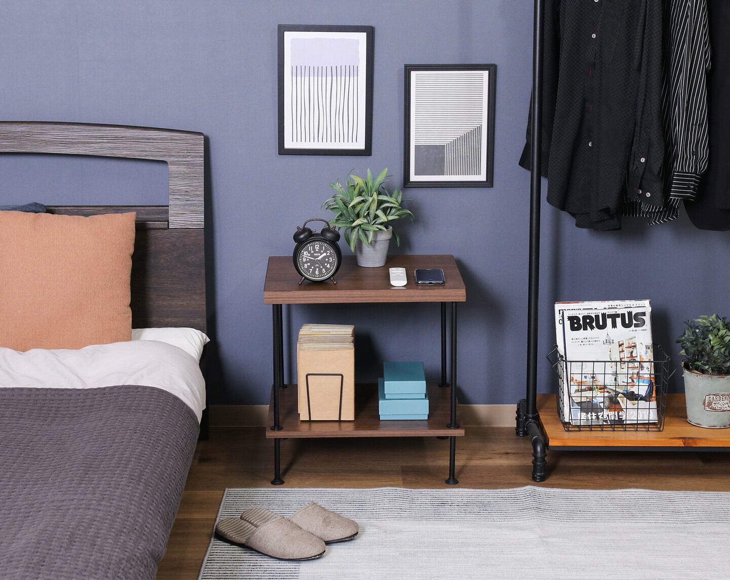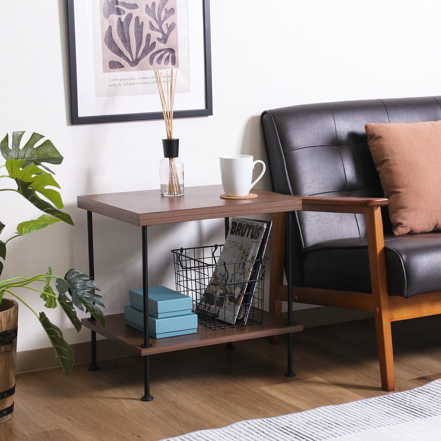 板の穴にワイヤーフレームを差し込みねじ込むだけで完成する「ツイストロックシステム」を採用したシリーズで、手軽におしゃれなインテリアを楽しめます。落ち着いた色味の木目とブラックスチールを合わせた相性の良い組み合わせで、お部屋にも馴染みます。高さ48cmでソファなどにも合わせて使いやすい。A4サイズのファイルや雑誌なども立てて収納できます。幅47×奥行40cmの広々とした天板は飲み物やお菓子、雑誌などを余裕をもって置くことができます。リビングだけでなく、ベッドサイドや玄関先など様々な場所で活躍します。