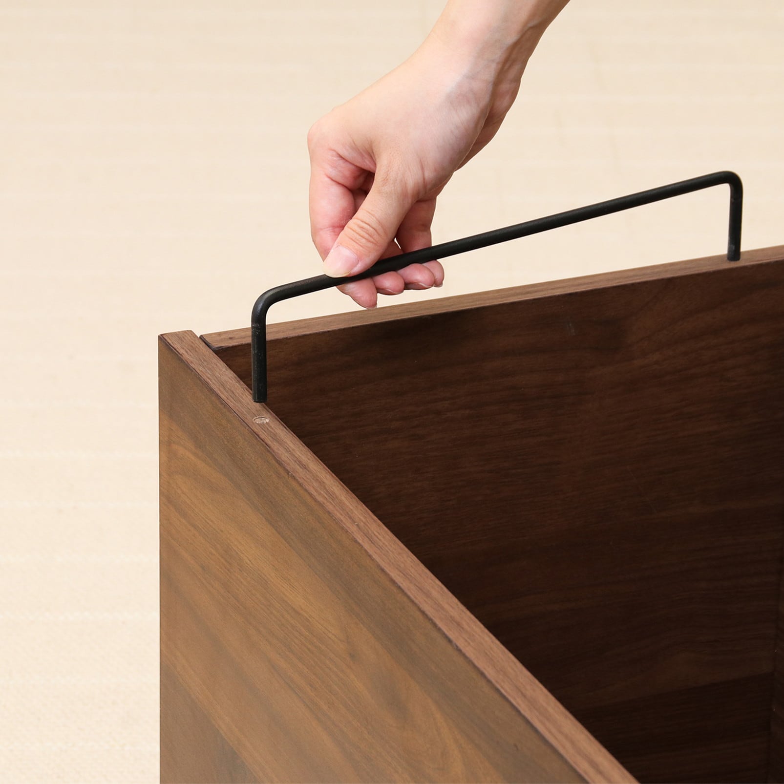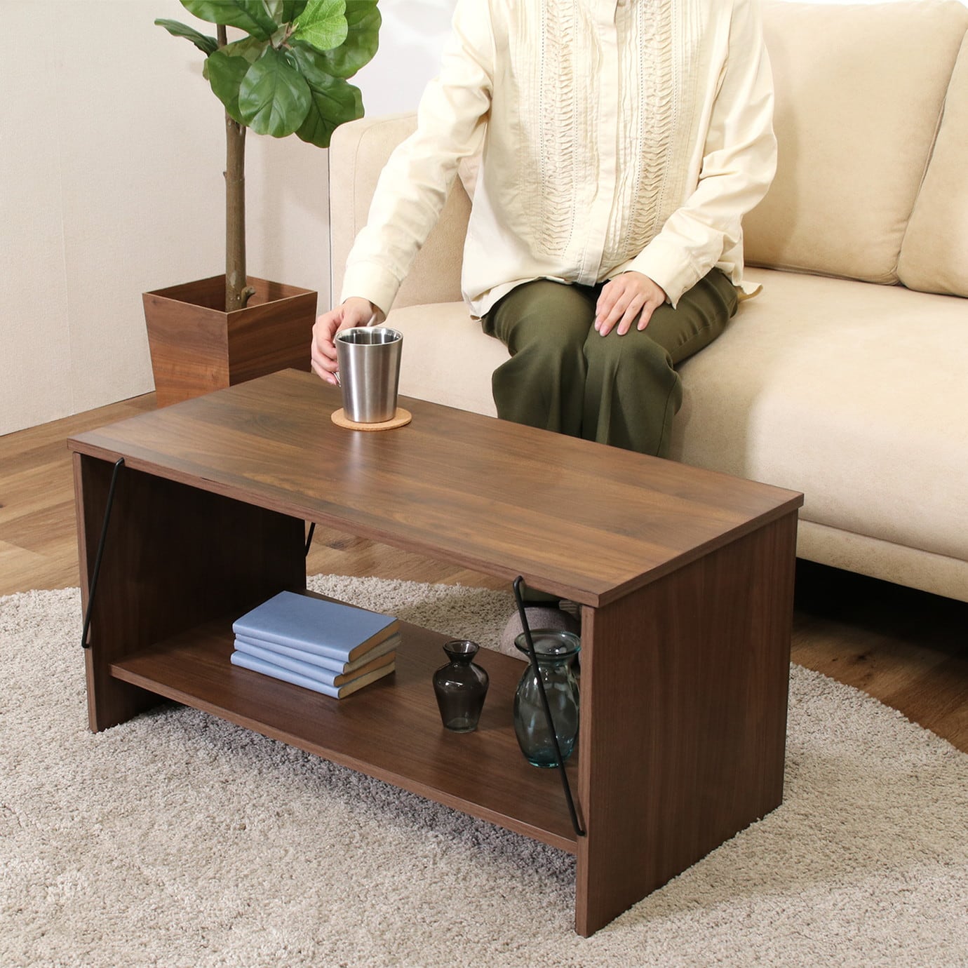 パーツを組み合わせるだけの「プッシュロックシステム」とワイヤーフレームを差し込むだけの「ワイヤーロックシステム」を組み合わせています。木目調の棚板とブラックスチールのワイヤーフレームで、空間をカッコよく見せてくれます。また、斜めにつけるスチールはお好みの位置に付けることができます。幅80×奥行40cmのコンパクトながらちょうどいいサイズ感。2人でお茶を楽しんだり、勉強や作業にも快適なスペース。天板下の収納棚は幅75×奥行35×高さ28.8cmで使い勝手抜群。リモコンや雑誌、冬場はブランケットなどを便利に収納できます。一般的なソファ座面高にも合う高さ40cm。飲み物を置いたり、ちょっとしたパソコン作業にもちょうどいい高さです。ワンルームのセンターテーブルとして最適なコンパクトさ。高さも低いので圧迫感もなくお使いいただけます。