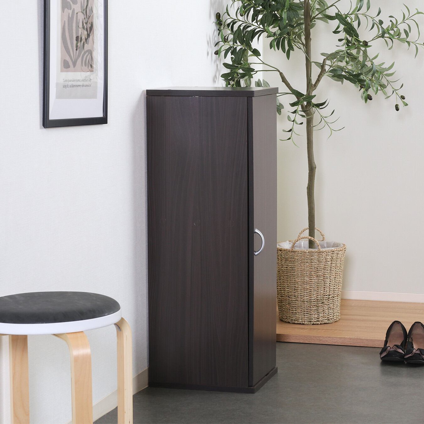 落ち着いたカラーリングでパブリック空間の玄関にも合わせやすく、長く使える飽きの来ないデザインです。幅28.7×奥行33cmのスリム幅で場所を取らずに設置できます。スリムながら大人の男性の靴も入る大きさで、しっかり収納できます。棚は靴のサイズに合わせて高さを調整できるので、ブーツなど高さのある靴も安心して収納できます。通気性が良いルーバー扉仕様。湿気がこもりにくくカビや臭いの発生を抑えてくれます。2台上下に連結可能となっており、一つで物足りない場合は追加して収納スペースを増やすことができます。