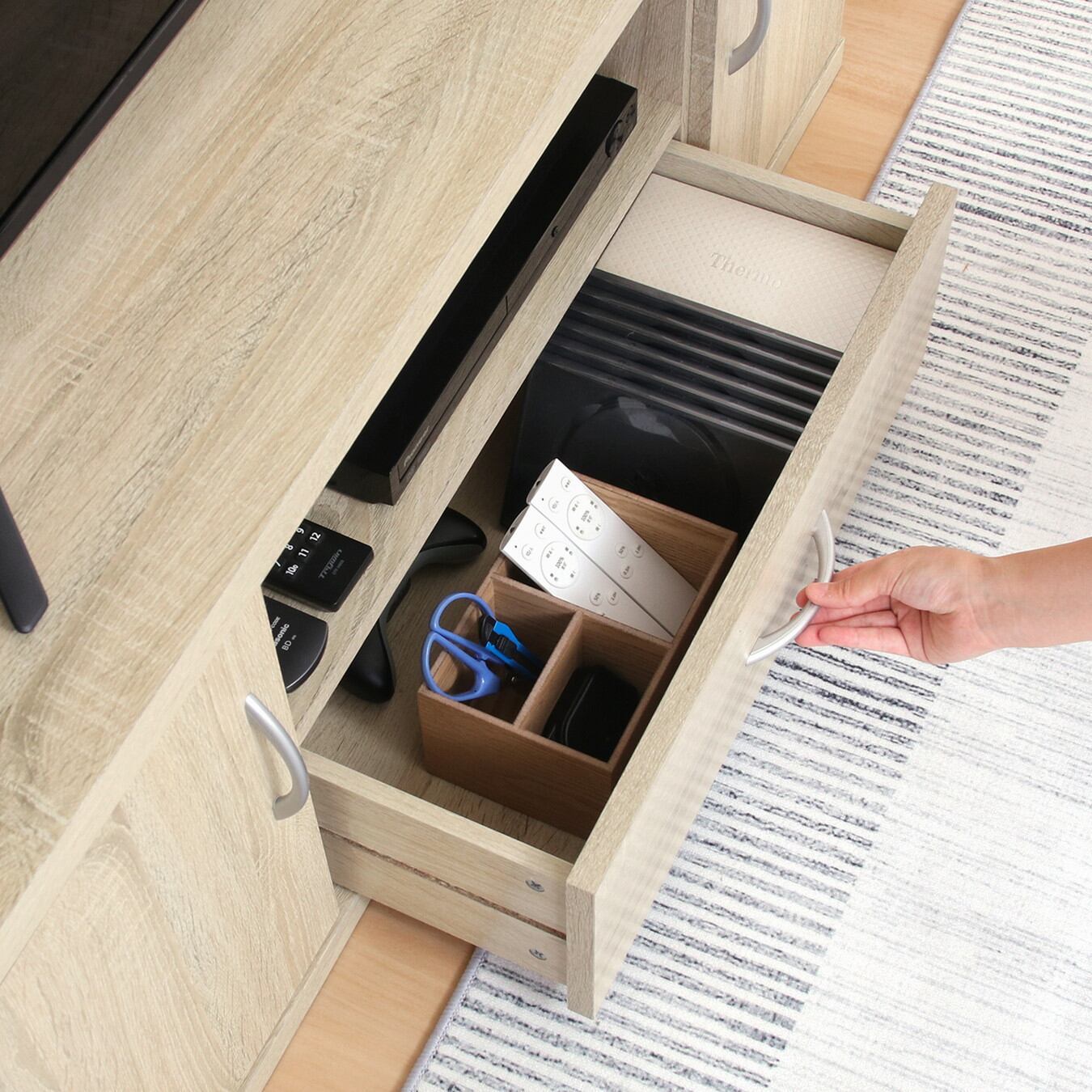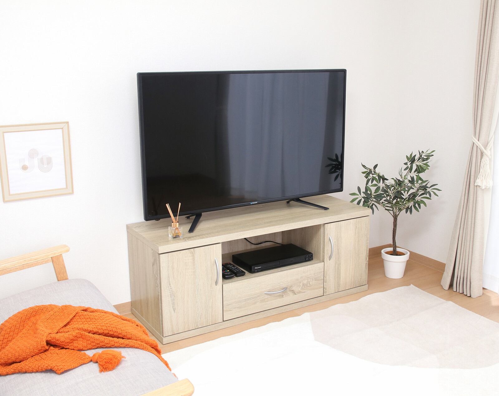 シンプルなデザインで、どんなお部屋にも優しく馴染みます。幅118×奥行41.5cmで37型テレビまで対応可能。収納もたっぷりですっきり片付きます。幅56×奥行35.5×高さ20cmのオープン収納スペースは、AV機器やゲーム機などの収納に◎幅27×奥行35.5×高さ38.5cmの扉部収納は、リモコンや小物類をすっきり収納!幅52.5×奥行32×高さ14cmの引き出しには、DVDやブルーレイのディスクをたっぷり収納できます。オープンスペースの背面にはコード穴がついており、配線を通すことができます。