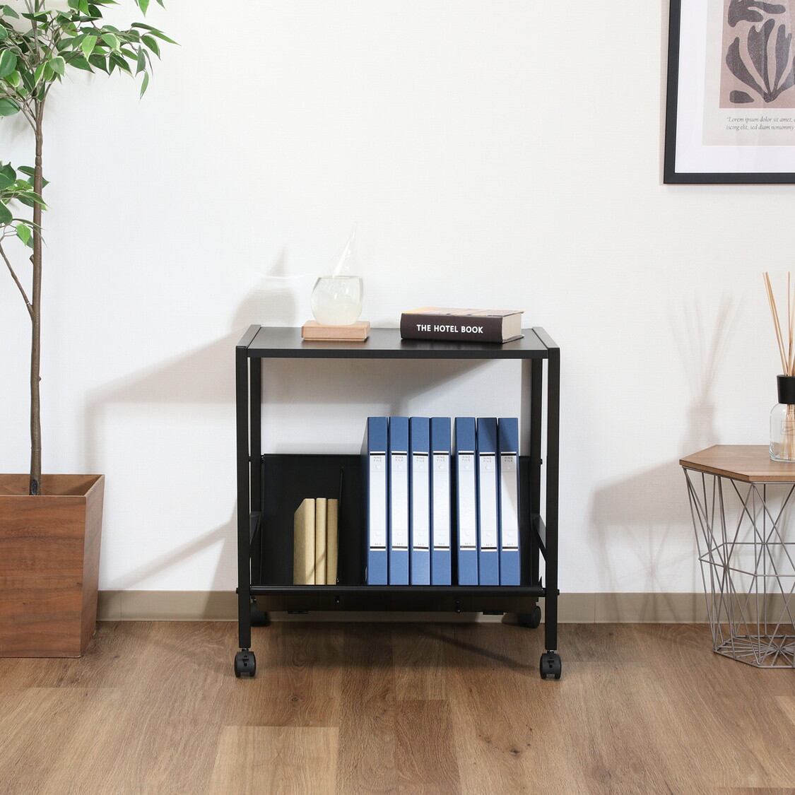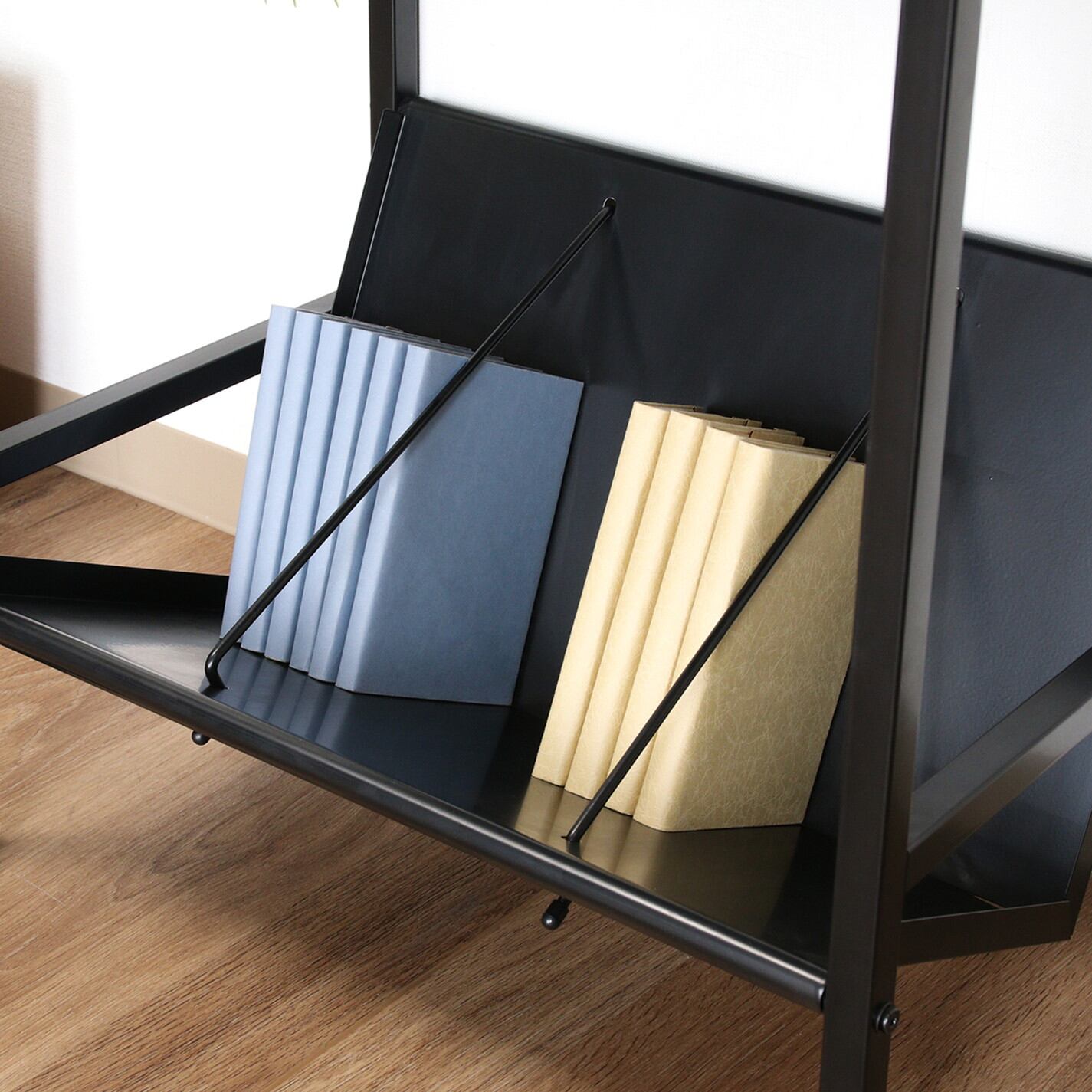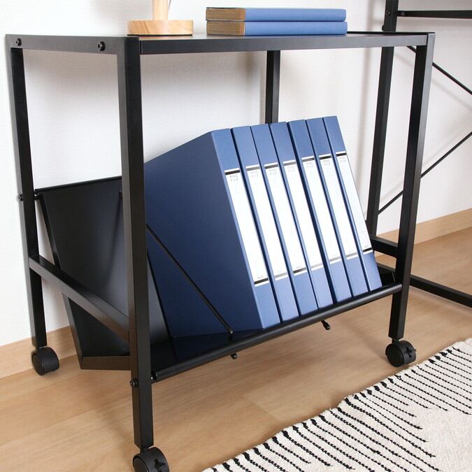 ご自宅でも職場でも使用しやすい、無駄のないシンプルなデザインです。棚自体が斜めになっているので背表紙が見やすく、出し入れしやすいデザインです。仕切りが付いているので、種類別に分けて収納できます。また転倒防止のブックエンドにもなります。A4サイズの書類もはみ出ることなく収まります。天板はメラミン樹脂ボードを使用しているので汚れてもサッとお手入れできます。キャスターが付いているので、重い書類を入れても手軽に移動できます。