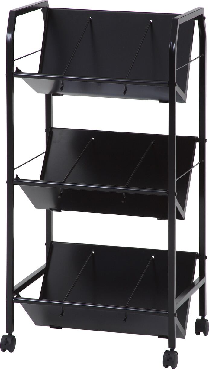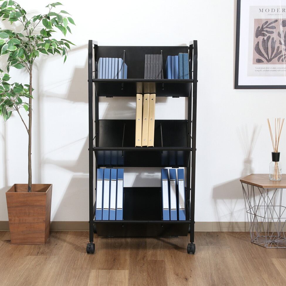 ご自宅でも職場でも使用しやすい、無駄のないシンプルなデザインです。棚自体が斜めになっているので背表紙が見やすく、出し入れしやすいデザインです。仕切りが付いているので、種類別に分けて収納できます。また転倒防止のブックエンドにもなります。A4サイズの書類もはみ出ることなく収まります。スチールなので汚れてもサッとお手入れできます。キャスターが付いているので、重い書類を入れても手軽に移動できます。