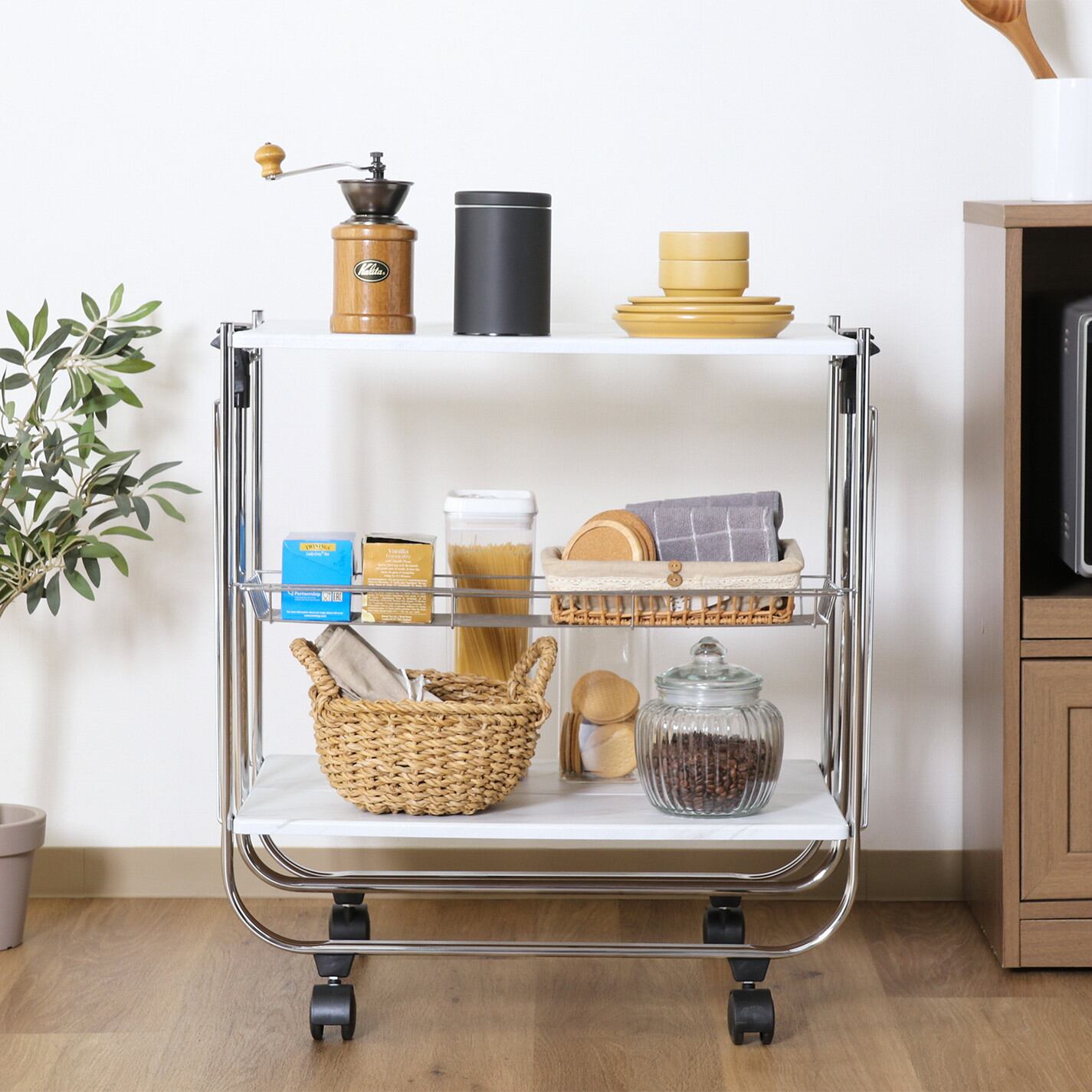 生活感のない都会派デザイン。お部屋が一気に垢抜けます。天板は幅60×奥行40cmで、簡易的な作業台としても余裕あるサイズ感です。ワゴン中段にはハーフサイズのバスケットがあり小さなものを収納。またバスケットがハーフサイズなので、下段スペースには高さのあるものまでしっかり収納できます。折りたたむと厚さ6.9cmになるので、使わないときは隙間に収納できます。汚れの目立ちにくい大理石柄。お手入れの際もサッと拭くだけでOK!キャスター付きで手軽に動かすことができ、お掃除のときも便利です。