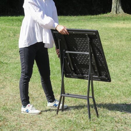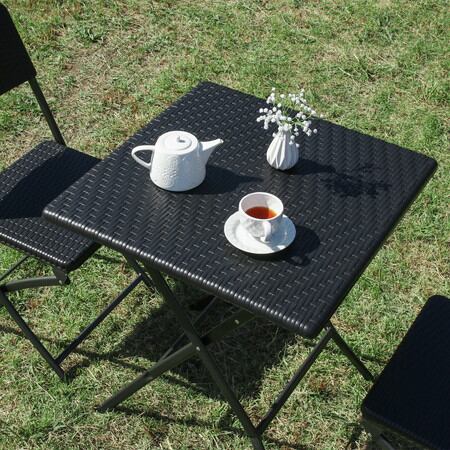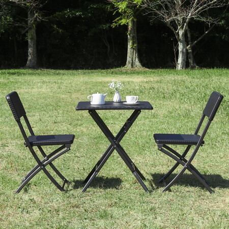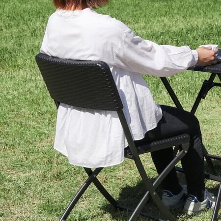 細身のラインでシンプルなデザインのテーブル&チェア2脚のガーデン3点セットです。ワントーンで統一され取り入れやすいカラーリング。プラスチックの中でも比較的軽いHDPEを使用しているので、チェアは4.2kg、テーブルは5.4kgと軽量で女性一人でも持ち運ぶことができます。1人でも2人でも十分に使える幅61.5×奥行61.5cmの天板で、リラックスしたひと時を過ごせます。角や背もたれに丸みがあり肌当たりも良いため、座り心地も快適です。折りたたむとテーブルは厚さ8cm、チェアは13.5cmになり、使わないときはコンパクトに収納できます。表面は、ラタン調(木目調)のエンボス加工が施してあり質感のある仕上がり。またフレームのスチールは粉体塗装を施し塗膜強度も強く、傷がつきにくいのが特徴です。