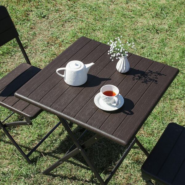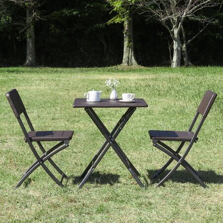 細身のラインでシンプルなデザインのテーブル&チェア2脚のガーデン3点セットです。ワントーンで統一され取り入れやすいカラーリング。プラスチックの中でも比較的軽いHDPEを使用しているので、チェアは4.2kg、テーブルは5.4kgと軽量で女性一人でも持ち運ぶことができます。1人でも2人でも十分に使える幅61.5×奥行61.5cmの天板で、リラックスしたひと時を過ごせます。角や背もたれに丸みがあり肌当たりも良いため、座り心地も快適です。折りたたむとテーブルは厚さ8cm、チェアは13.5cmになり、使わないときはコンパクトに収納できます。表面は、ラタン調(木目調)のエンボス加工が施してあり質感のある仕上がり。またフレームのスチールは粉体塗装を施し塗膜強度も強く、傷がつきにくいのが特徴です。