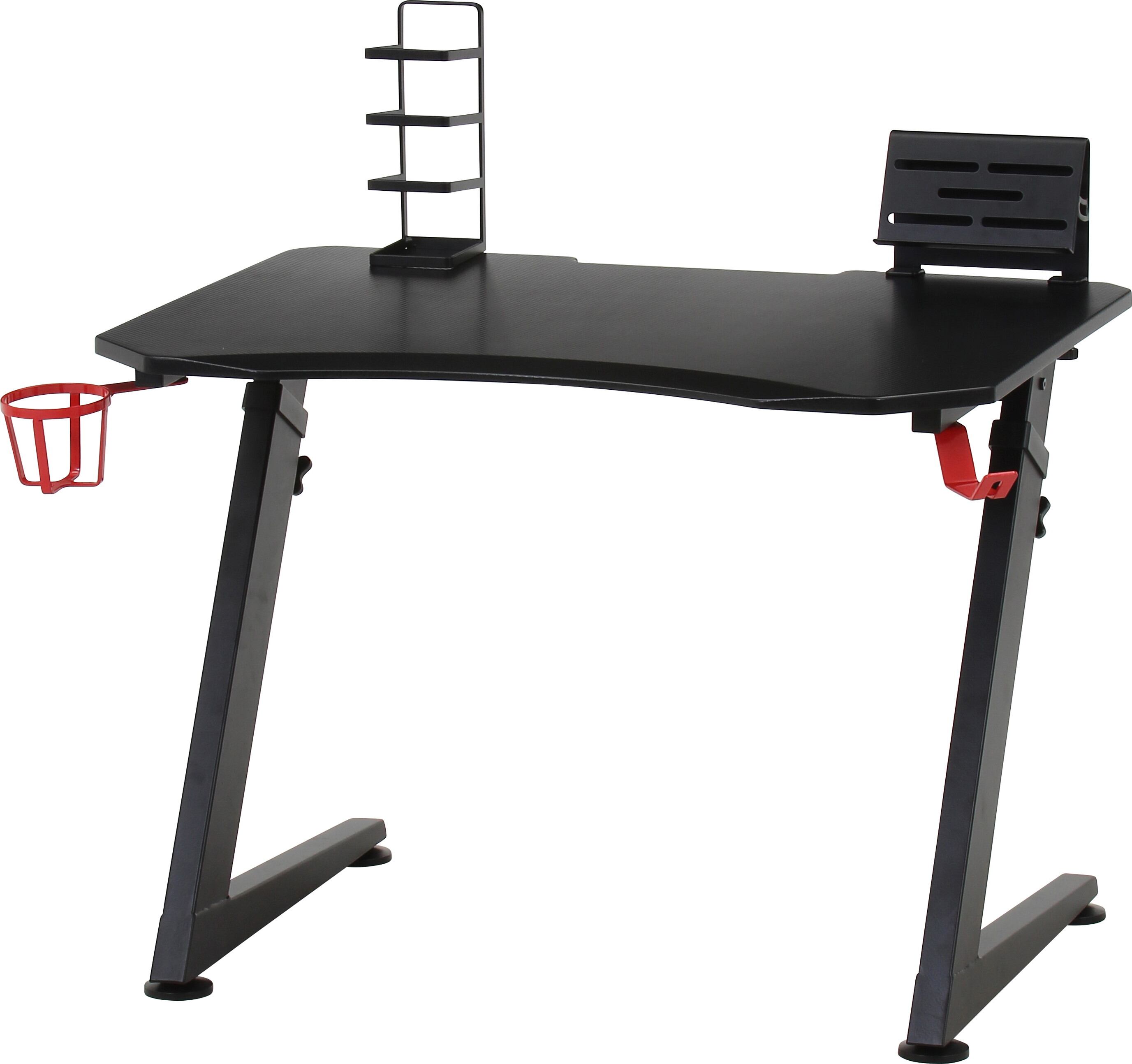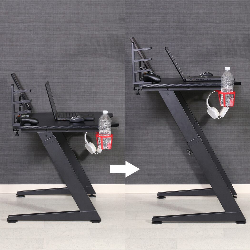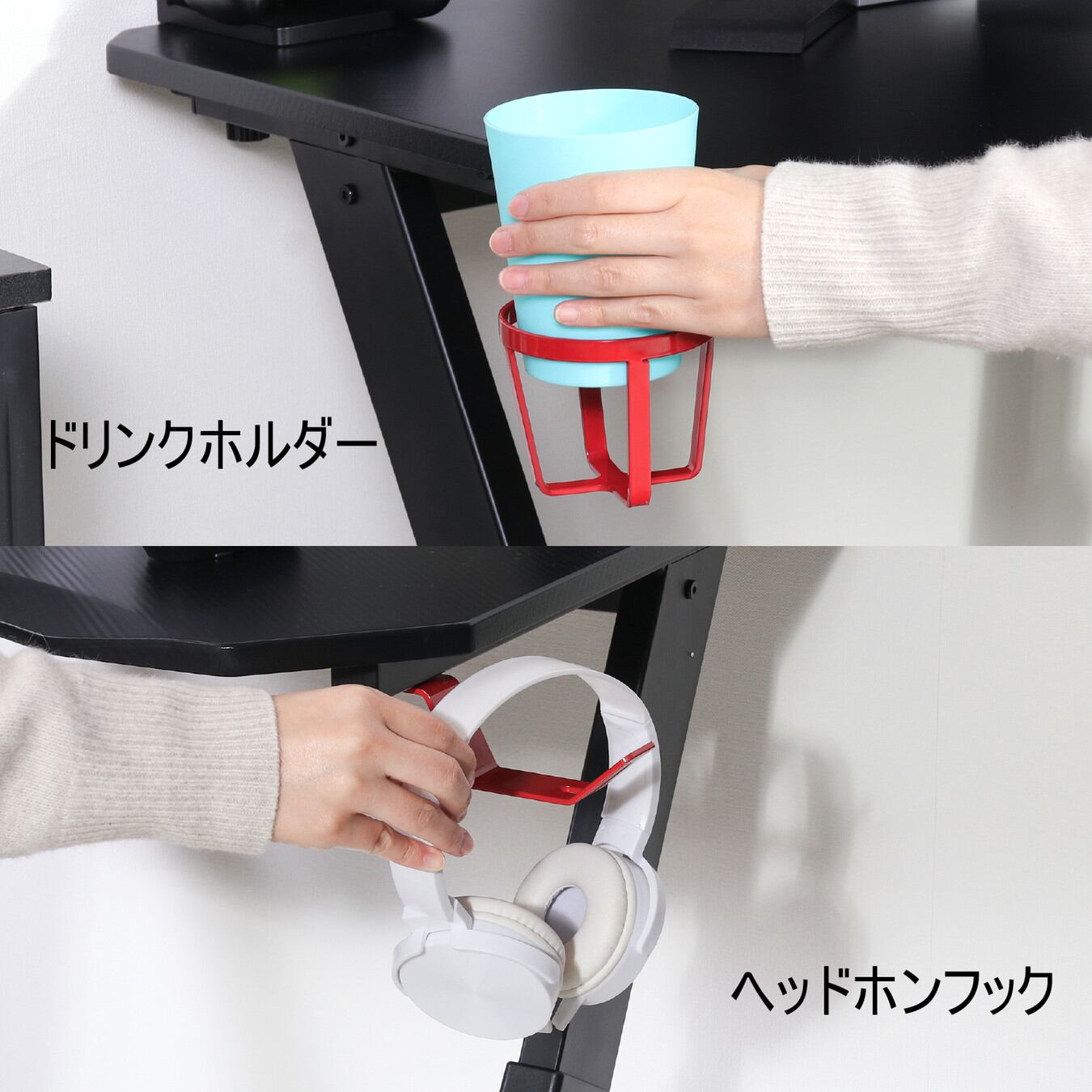 デスク下に格納できる「ヘッドフォンフック」と「ドリンクホルダー」付き。組み立てた時に左右どちらでも取り付けが可能です。お好みの位置に設置できるコントローラースタンド付き。様々なコントローラーを収納できます。お好みの位置に設置できるタブレットスタンド付き。画面の見やすさはもちろん、PCモニターに出力する際も便利です。天板の高さを59.5cmから3cm間隔で7段階の調整が可能。最大80.5cmまで上げて使うことができます。天板は幅80×奥行60cmでデスクトップも置ける十分な大きさ。勉強する際にも教科書とノートを一緒に広げることができます。配線用の切り欠き付きなので、コードを挟まず壁にべた付けできます。また、高さの微調整ができる調整脚付き。水平に設置することで、がたつきを防止します。