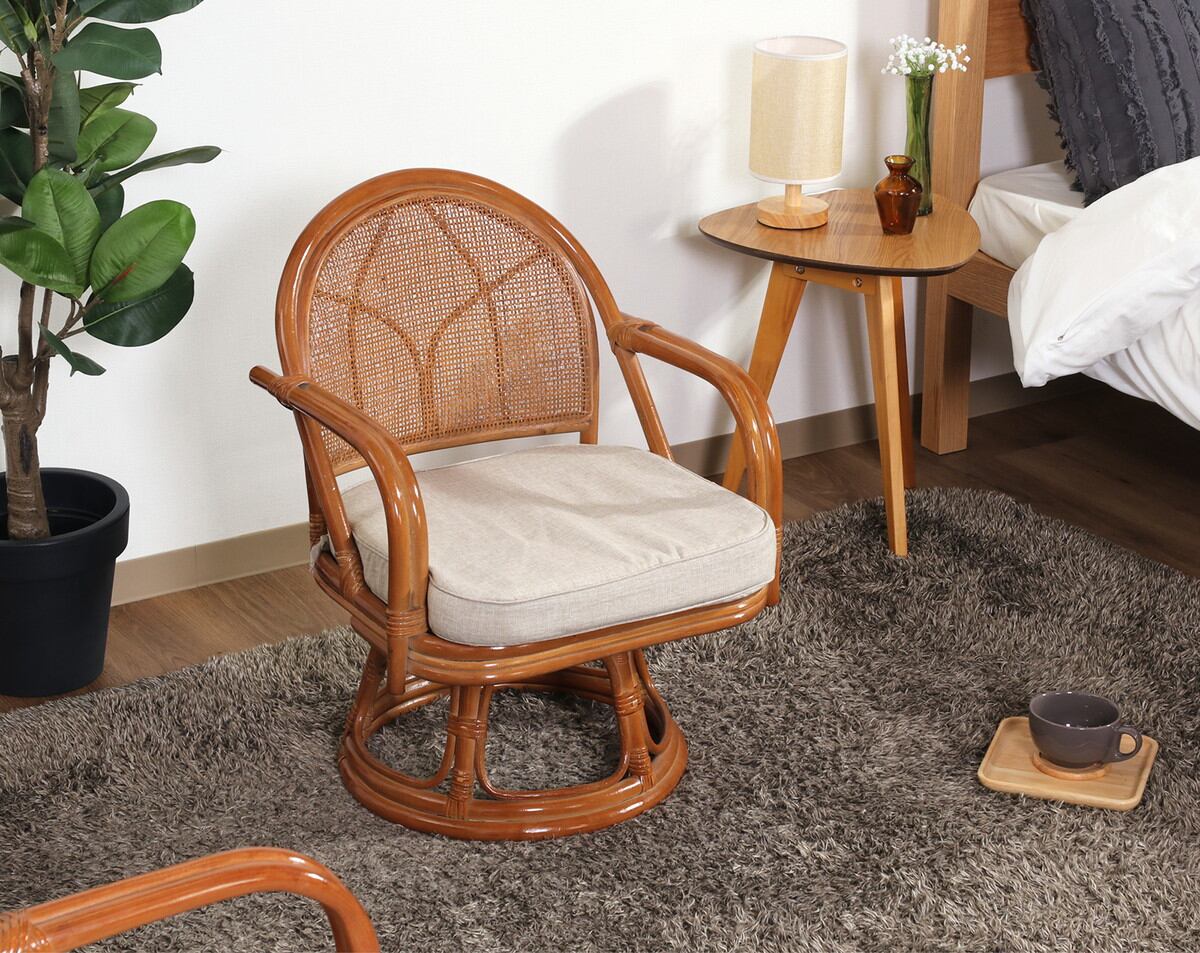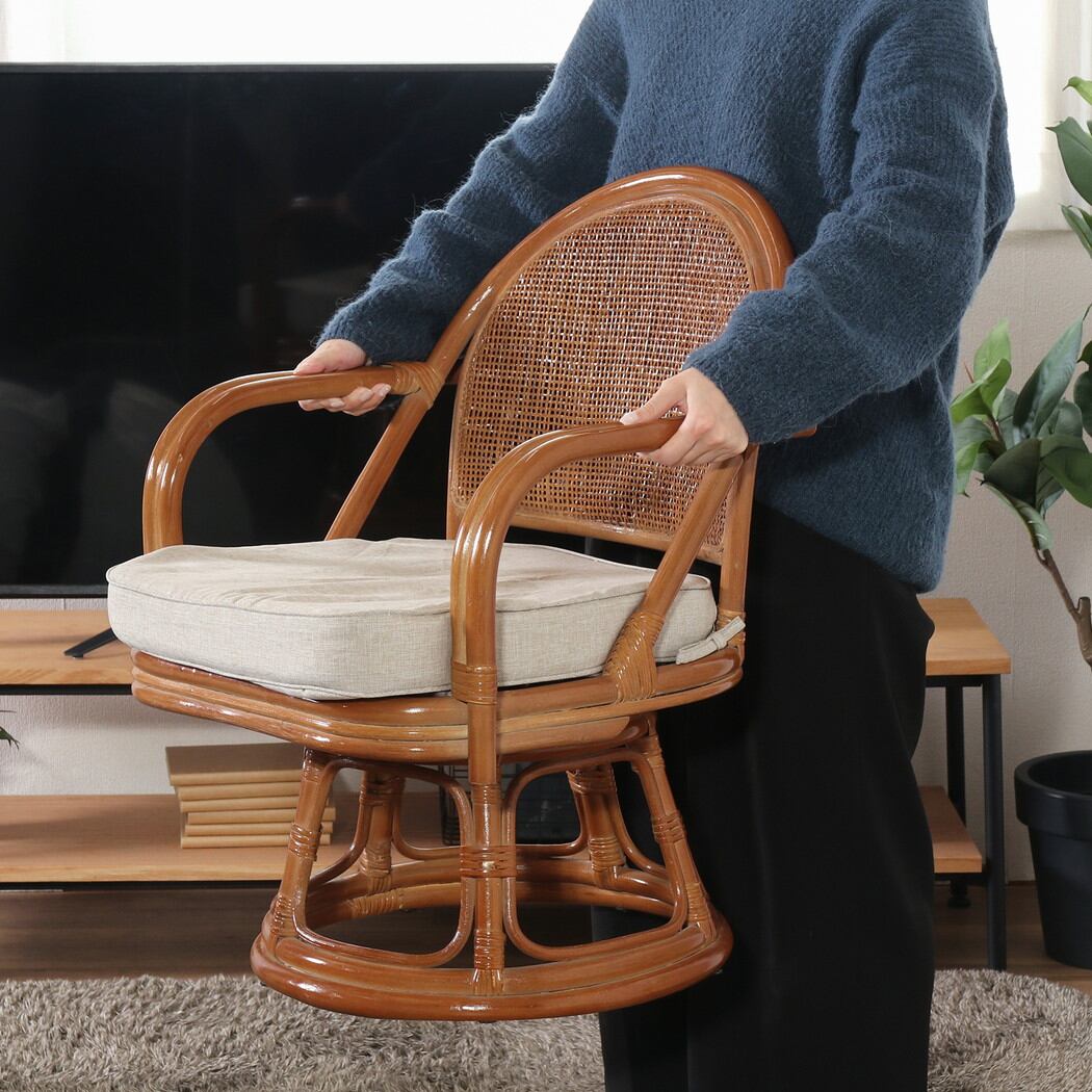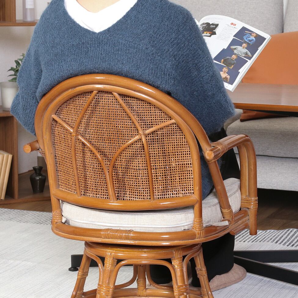 自然な風合いを感じられる天然素材のラタン。お部屋に落ち着きある温もりを与えてくれます。座面は360度回転するので、狭いスペースでの立ち座りも可能!座ったまま体の向きを変えられるのも◎座面はウレタンフォームで厚みがあり、クッション性バツグン!長時間座っていても快適です。両サイドにアームがついているので、ご年配の方も立ち座りの動作をラクに行えます。背もたれは丈夫なカゴメ編みになっているので、安心して体重を預けることができます。ラタン素材で軽量なため、お掃除のときもサクッと動かすことができます。