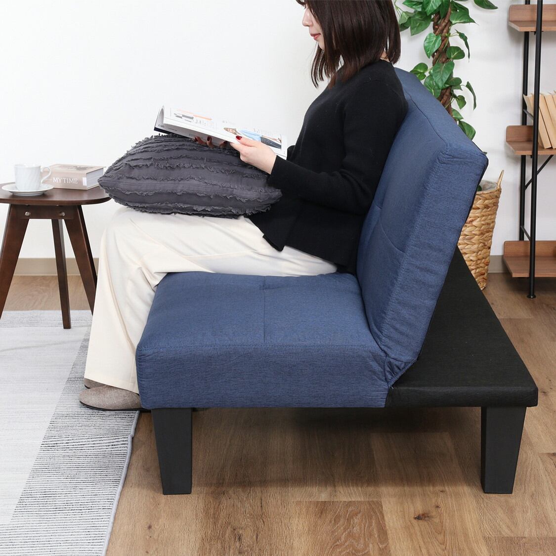 3人掛けにも対応できる170cmの幅広タイプ。スリムなデザインでお部屋に圧迫感を出しません。背もたれを倒すと幅170×奥行96cmのベッドになり、ゆったりと寝転がることができます。沈み込みすぎないほどよい硬さで、快適な座り心地です。耐荷重は180kg。シチュエーションに合わせて3段階で背もたれを調節できます。夏はべたつかず、冬はひんやりとしない、ファブリック素材を使用しています。ソファの下は20cmあるので、柄の長い掃除用品やロボット掃除機も通れます。埃が溜まりやすいソファの下を綺麗に保つことができます。