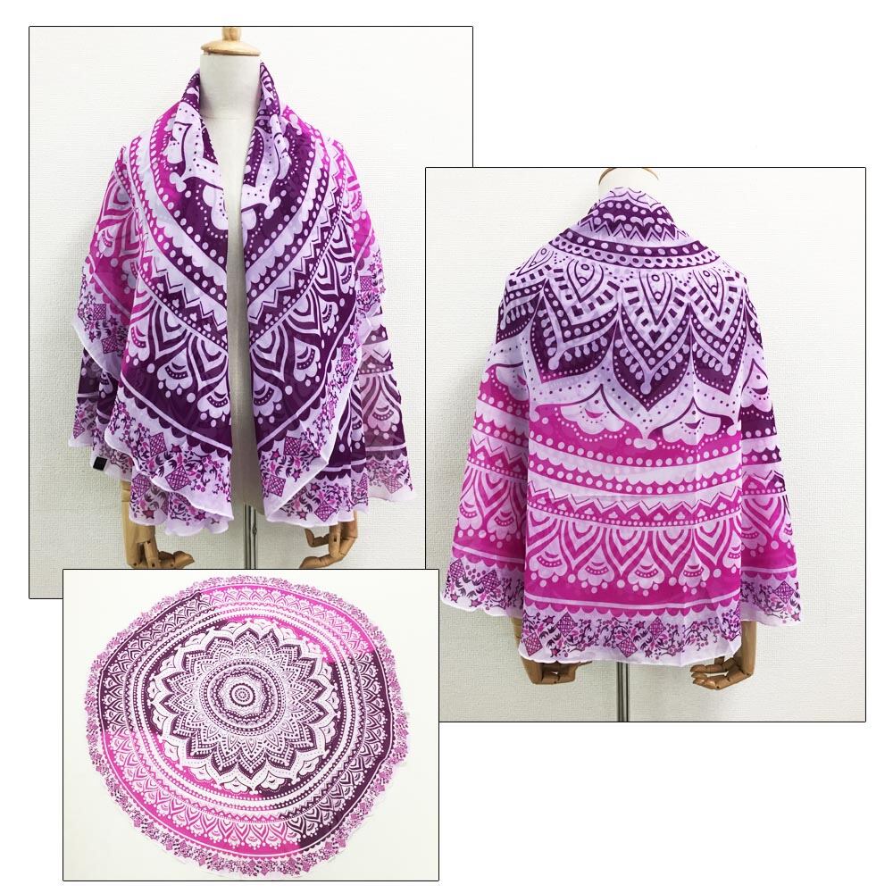 四角の多い中少し珍しい円形のレディース大判ストール同色系のグラデーションデザインなので柄物でも派手すぎない海外セレブには大変人気があり、日本でも今大注目の薄手ストールカラー:ブルー/パープル素材:ポリエステル100%サイズ:直径144cm伸縮性:なし透け感:あり生産国:中国※採寸方法違いより、多少の誤差がございますので、ご了承ください。※海外輸入品のため、商品の仕様は予告なく変更になる場合がございます。交換/返品対象外になりますので、ご了承下さい。※製品にサイズタグ等が無いものがありますが不良ではございません、ご了承くださいませ。