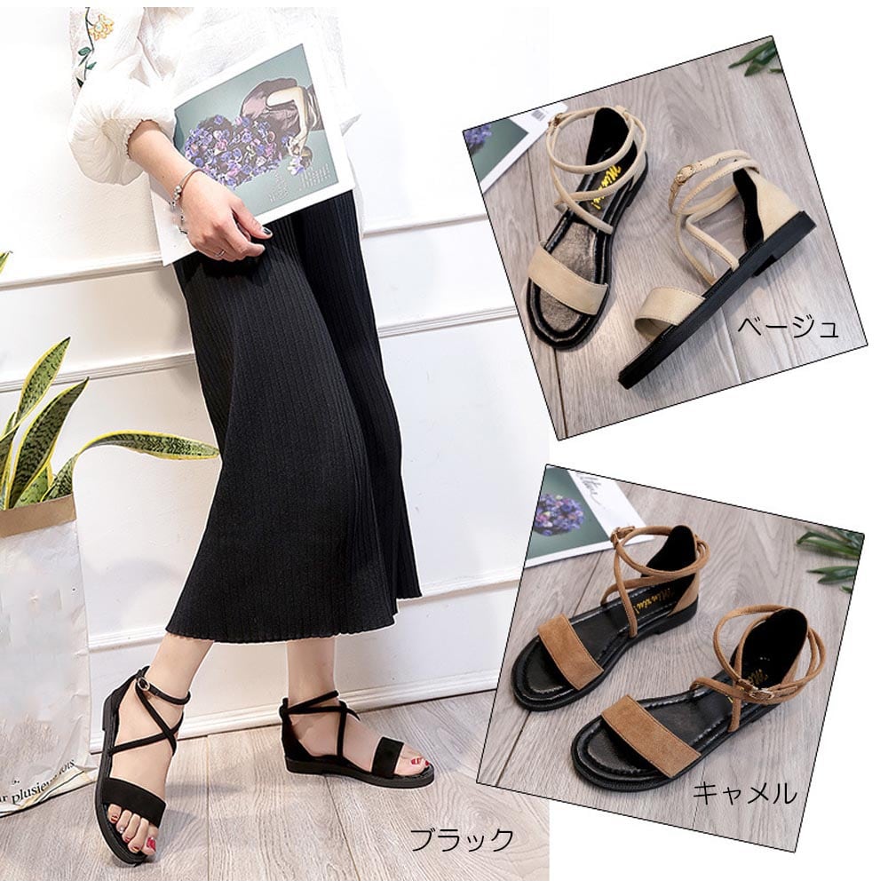美脚も快適もこれ一足で実現できるアンクルストラップサンダルホールド感のあるかかと部分、クロス仕様のストラップで安定感抜群ヒールの高低差が感じないフラットサンダルだから、疲れない楽ちんな履き心地カラー:ブラック/ベージュ/キャメル素材:合成繊維-合成底サイズ:22.5cm(35)/23.0cm(36)/23.5cm(37)/24.0cm(38)/24.5cm(39)甲周り:[全サイズ]約11cmヒール:[全サイズ]約2cm重さ(両足):約323g-366g生産国:中国※すべて平置きサイズです(採寸方法違いより、多少の誤差がございますので、ご了承ください)。※海外輸入品のため、商品の細部仕様は予告なく変更になる場合がございます。交換/返品対象外になりますので、ご了承下さい。