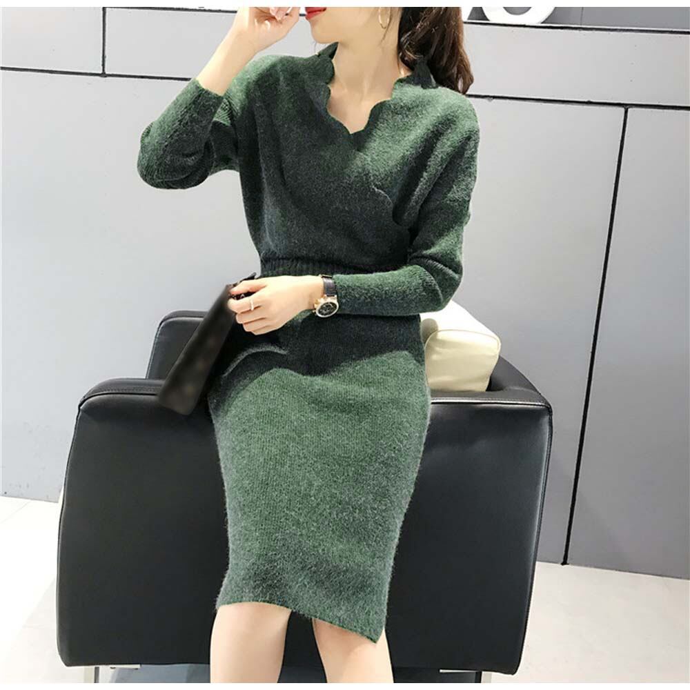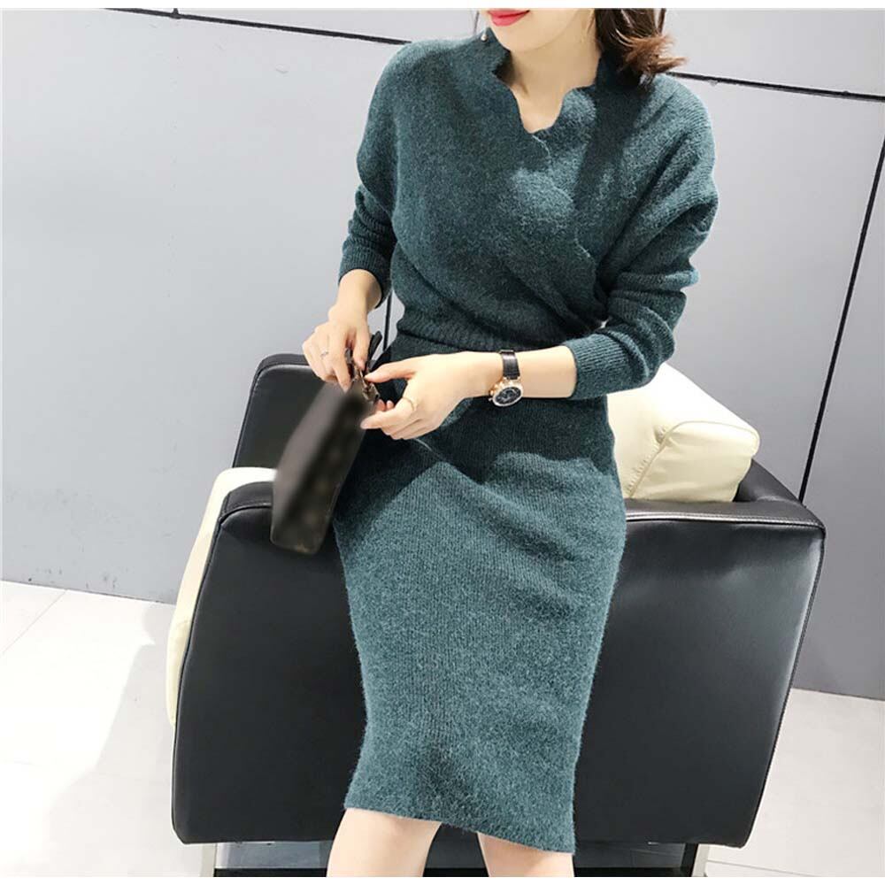【日本倉庫即納】 ニットワンピース vネック ワンピース 秋冬 膝丈 タイト ワンピ ミディアム
