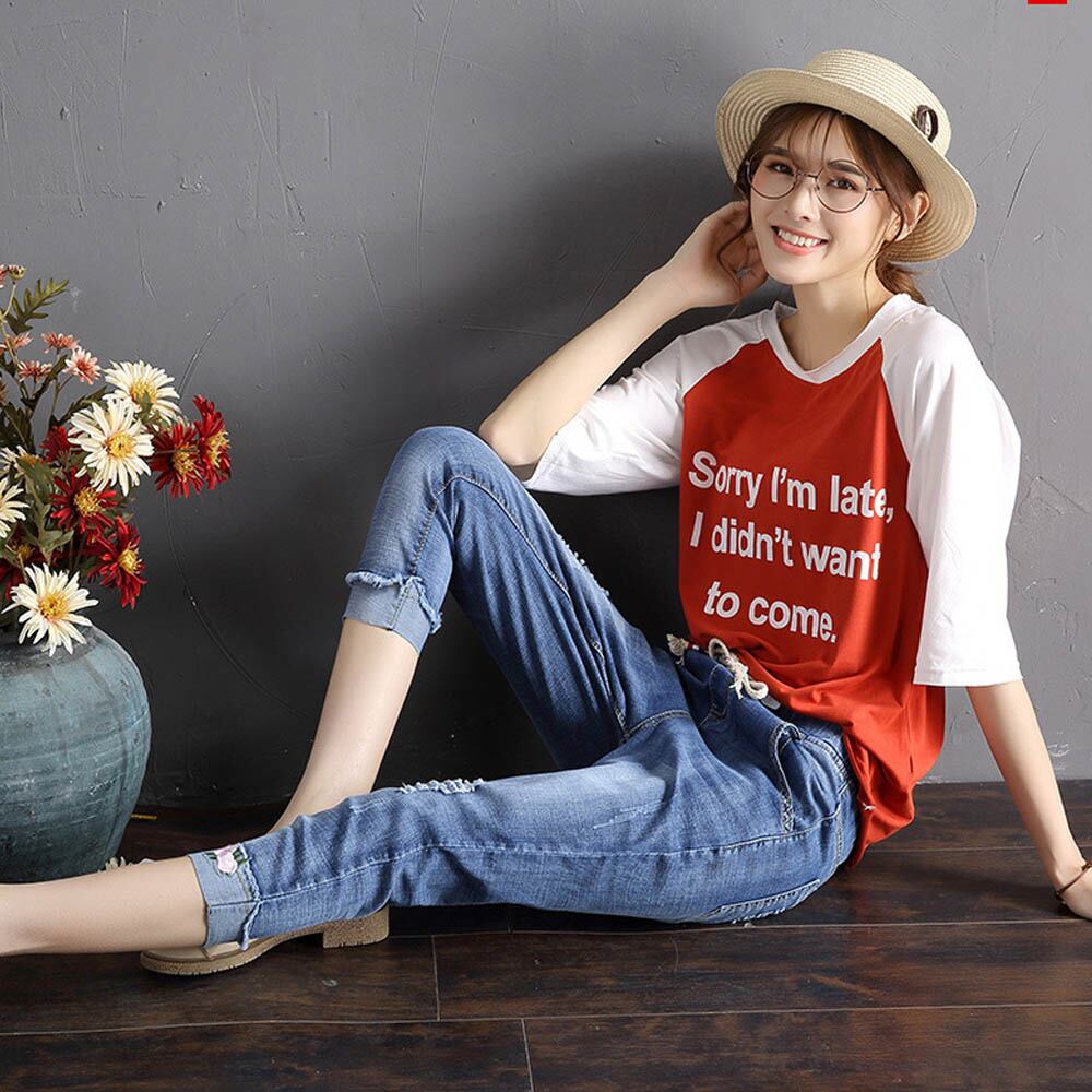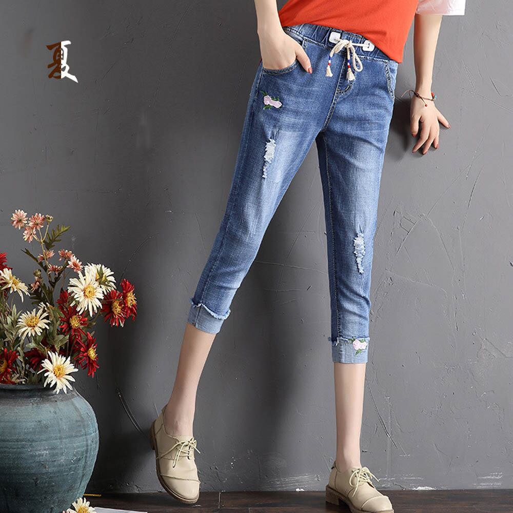 【日本倉庫即納】 デニムパンツ 7分 ズボン ゴムウエスト ダメージデニム レディース