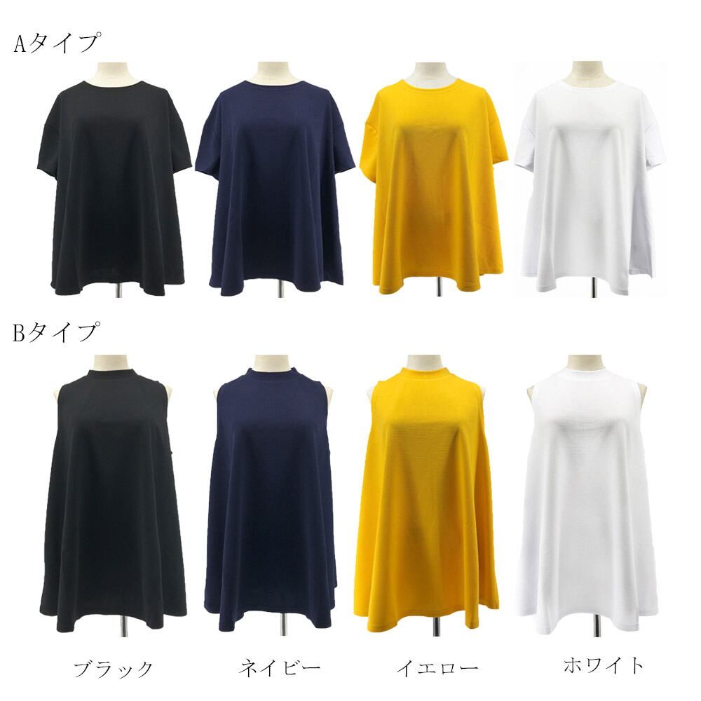 ボリューム感たっぷりの半袖カットソー、ノースリーブチュニックふんわり広がるフレアラインで体型カバー力も抜群パンツとも合わせやすい丈感で色々なコーデが楽しめる1枚タイプ:A.Bカラー:ブラック/ホワイト/ネイビー/イエロー素材:ポリエステル95%+ポリウレタン5%サイズ:ワンサイズ[Aタイプ]着丈:約65cm 肩幅:約57cm 袖丈:約15cm ゆき:約43.5cm 身幅:約70cm 胸囲:約140cm[Bタイプ]着丈:約72cm 肩幅:約30cm 袖丈:約0cm ゆき:約15cm 身幅:約55cm 胸囲:約110cm裏地:なし伸縮性:若干あり透け感:淡色のみ若干あり生産国:中国※すべて平置きサイズです(採寸方法違いより、多少の誤差がございますので、ご了承ください)。※濃い色は汗や湿気、摩擦により、色移りをすることがあります。淡色の物とのコーディネートはお避け下さい。必ず単品洗いをして下さい。また洗濯後、濡れたまま長時間放置しないでください。※お洗濯方法によっては縮みや色あせの可能性があります。乾燥機等のご使用はお控え下さい。※海外輸入品のため、商品の細部仕様は予告なく変更になる場合がございます。生産時期、お届け時期によって、生地の厚みに差異がございます。交換/返品対象外になりますので、ご了承下さい。※ワンサイズ商品にタグが付いても商品とは関係ございません。ご了承くださいませ。