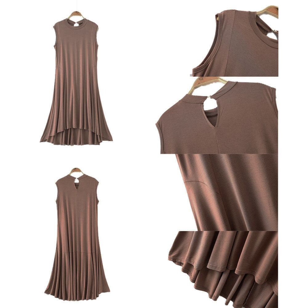 アシンメトリー裾のフィッシュテールデザインがお洒落な膝丈ワンピースさらっとテロンとしたモダール生地で汗ばむ季節でもストレスフリーな着心地を実現、ストンと落ち感もあって体型カバーもしてくれるノースリーブ仕様なのでそのまま1枚で着てももちろんOK、トップスとレイヤードコーデを楽しんだり、ライトアウターと合わせたりしてロングシーズン大活躍のアイテムカラー:ブラック/スモーキーネイビー/ココアブラウン素材:綿65%+ポリエステル35%サイズ:ワンサイズ総丈:前約83cm 総丈:後約105cm 身幅:約44cm 胸囲:約88-150cm ウエスト:約90-150cm ヒップ:約140-190cm裏地:なし伸縮性:あり透け感:なし生産国:中国※すべて平置きサイズです(採寸方法違いより、多少の誤差がございますので、ご了承ください)。※海外輸入品のため、商品の細部仕様は予告なく変更になる場合がございます。交換/返品対象外になりますので、ご了承下さい。※ワンサイズ商品にタグが付いても商品とは関係ございません。ご了承くださいませ。