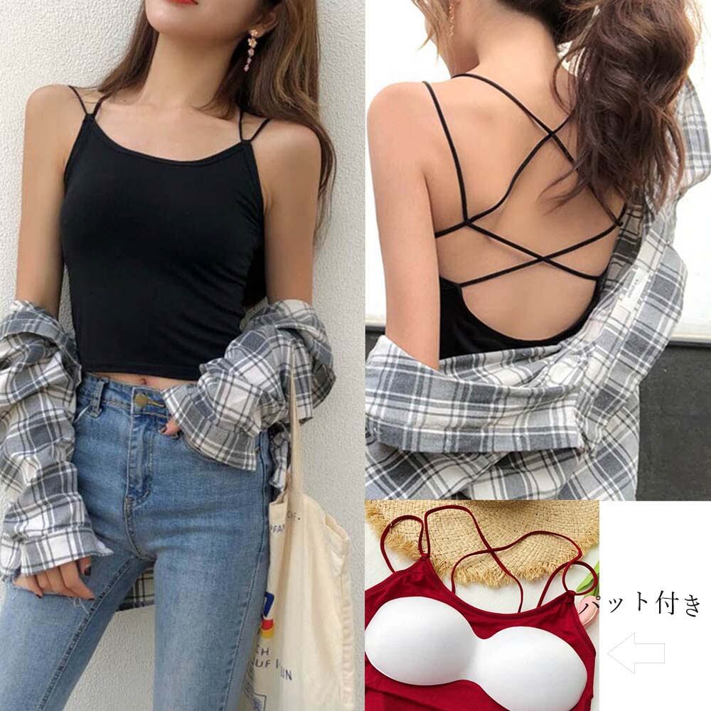背中あき キャミソール パッド付き バックオープン バッククロス キャミソールインナー キャミ キャミソール重ね着 見せるキャミソールシンプルながらもおしゃれなバッククロスストラップの背中見せキャミソール 心地よいフィット感、パッド付きで胸の安定感をサポートしながら優しい着心地 後ろ姿でも抜かりなく、すっきりした印象でトレンドの背中開きアウターと合わせればこれだけで旬顔コーデになる素材:綿65%+ポリエステル35%カラー:ブラック/ホワイト/グレー/ブラウン/キャメル/レッド/カーキ/ピンク/グリーン サイズ:ワンサイズ 着丈:約51cm 身幅:約31cm 胸囲:約62-100cm 裏地:なし 伸縮性:あり 透け感:なし 生産国:中国※すべて平置きサイズです(採寸方法違いより、多少の誤差がございますので、ご了承ください)。 ※海外輸入品のため、商品の細部仕様は多少異なる場合がございます、ご了承下さい。 ※ワンサイズ商品にタグが付いても商品とは関係ございません。ご了承くださいませ。