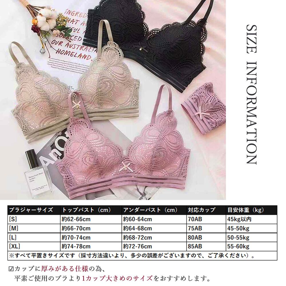 ノンワイヤーブラジャーとセクシーショーツのセットショーツはレースから透ける"バック透け"のデザイン身に着けるだけで大人の女性の魅力を引き出してくれる特別な夜に着たいランジェリー●サイズブラジャー:[S]32/70 70AB トップバスト:約81-85cm アンダーバスト:約68-72cm[M]34/75 75AB トップバスト:約86-90cm アンダーバスト:約73-77cm[L]36/80 80BC トップバスト:約93-97cm アンダーバスト:約78-82cm[XL]38/85 85CD トップバスト:約98-102cm アンダーバスト:約83-87cmショーツ:股上:約20cm ウエスト:約50-78cm ヒップ:約58cm※ショーツは全カラー・全サイズ共通のワンサイズ仕様です。●仕様3/4カップ、肩紐取外し不可、ワイヤー:なし●効果谷間づくり、ボリュームUP補正機能:なしワイヤー:なしカップ:あり裏地:なし伸縮性:あり透け感:あり生産国:中国※海外輸入品のため、商品の細部仕様は予告なく変更になる場合がございます。交換/返品対象外になりますので、ご了承下さい。