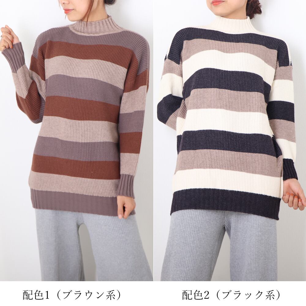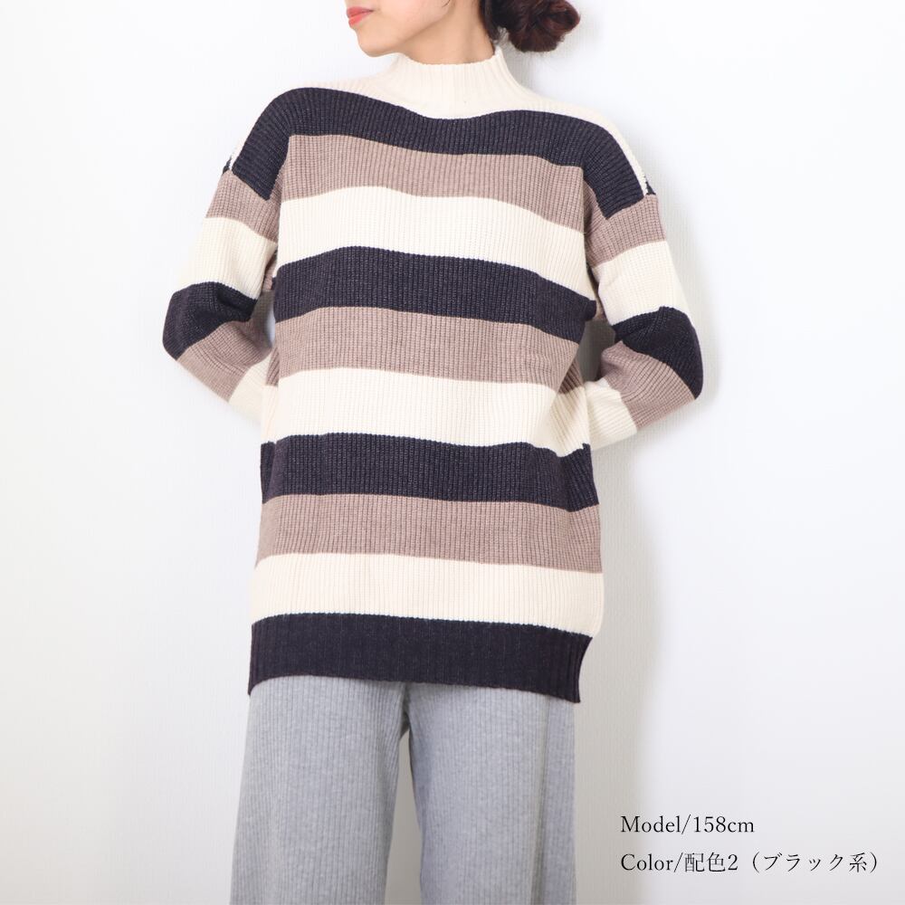太めボーダーの配色が可愛いハイネックセーターふんわり柔らかな心地良さで、主に秋冬を中心に活躍する程よい厚みのニットですデイリーユースにおススメですが、カジュアルなデートなどにもおススメです!!カラー:配色1(ブラウン系)/配色2(ブラック系)素材::アクリル100%サイズ:ワンサイズ着丈:約67cm 肩幅:約52cm 袖丈:約42cm ゆき:約68cm 身幅:約47cm 胸囲:約94-160cm裏地:なし伸縮性:あり透け感:なし生産国:中国※すべて平置きサイズです(採寸方法違いより、多少の誤差がございますので、ご了承ください)。※海外輸入品のため、商品の細部仕様は予告なく変更になる場合がございます。交換/返品対象外になりますので、ご了承下さい。