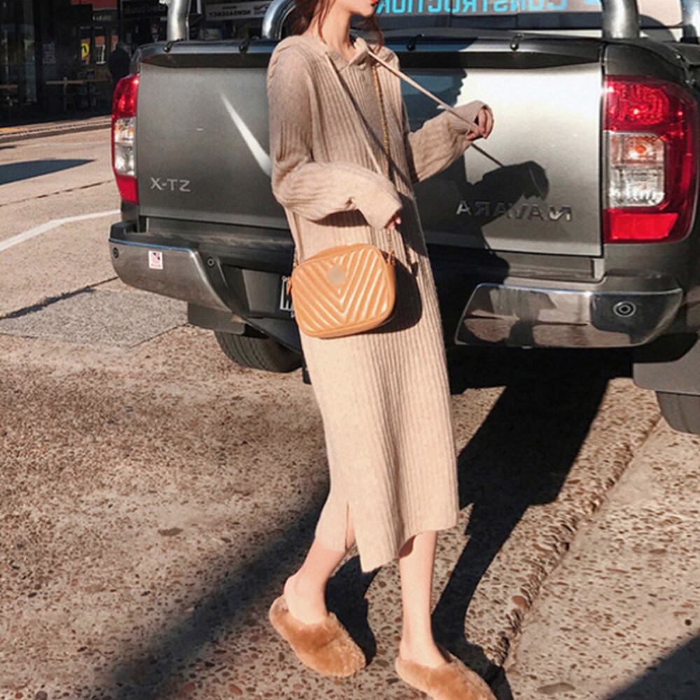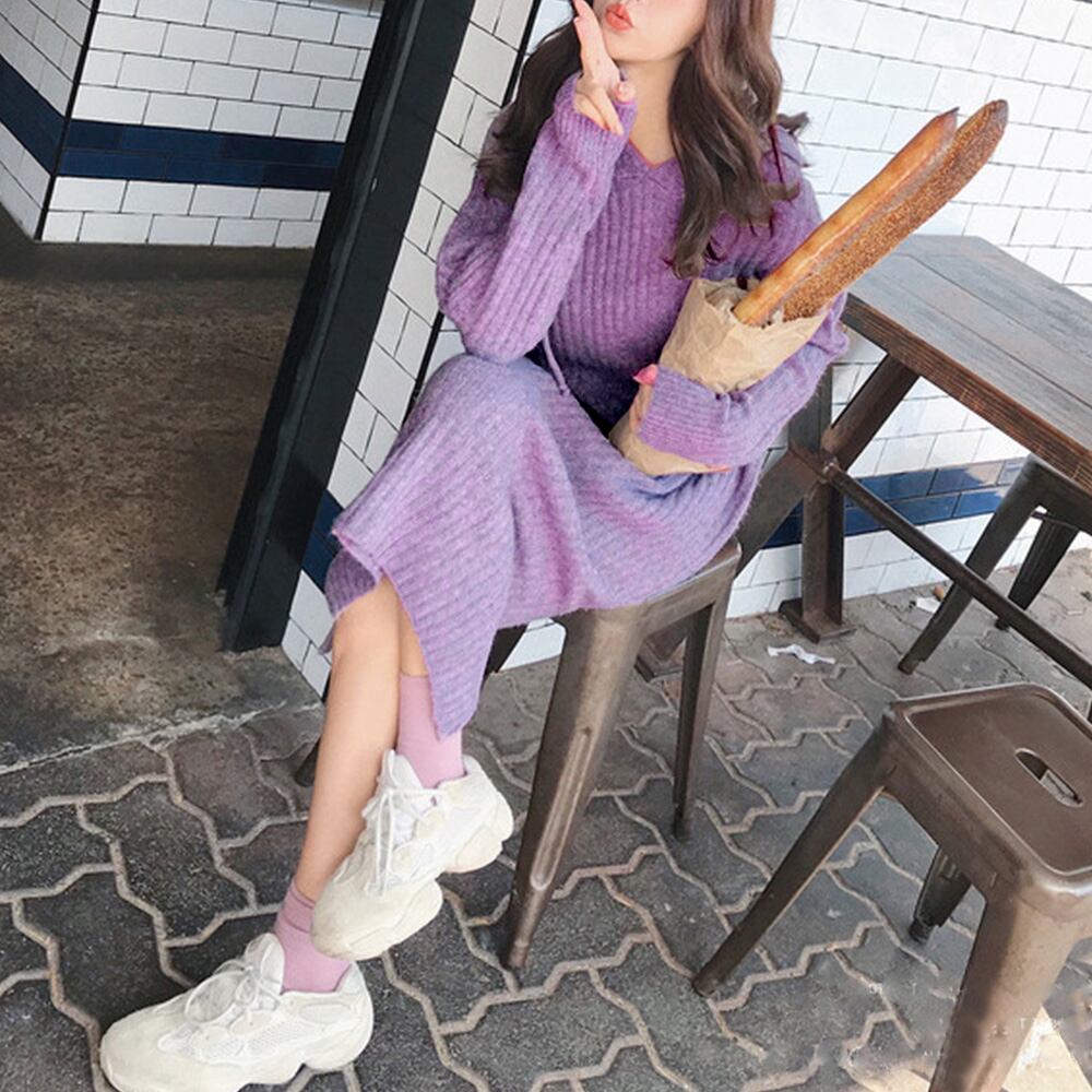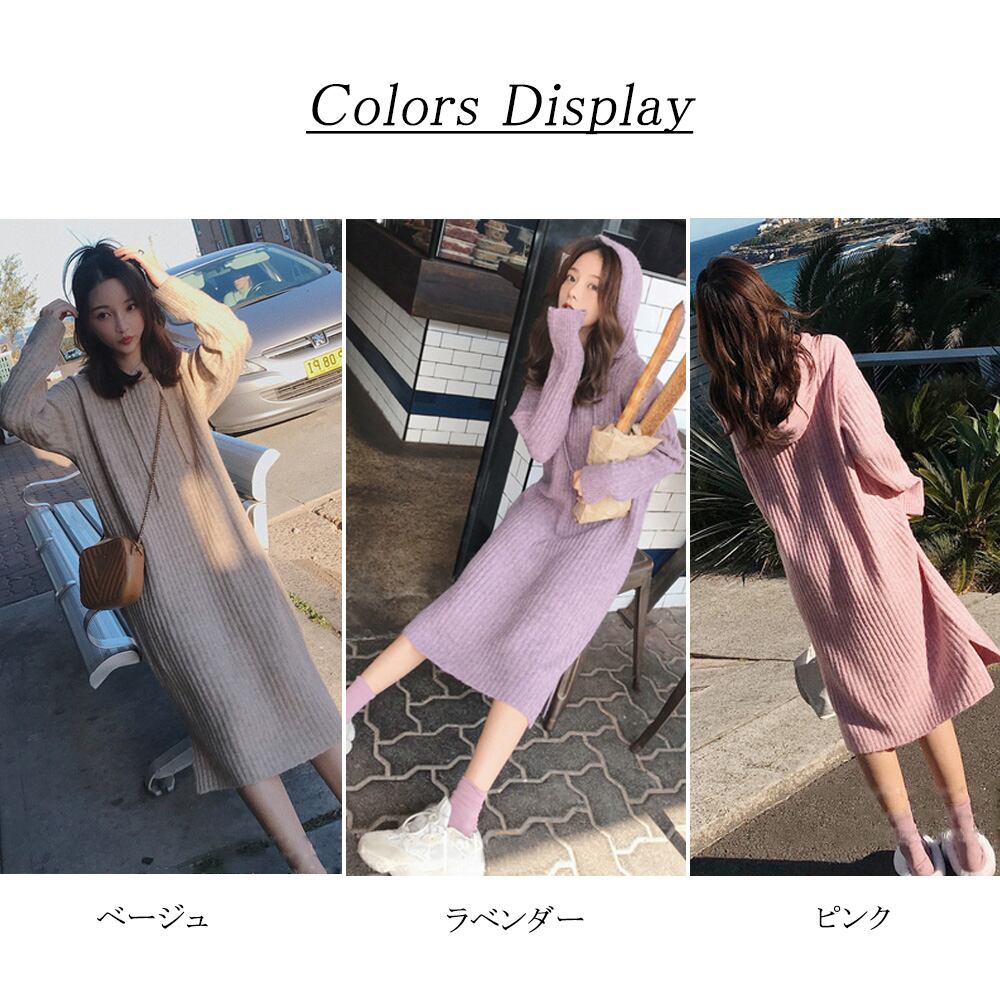 【日本倉庫即納】 リブニットワンピース レディース 秋冬 ミモレ丈 パーカーワンピ ストレッチ