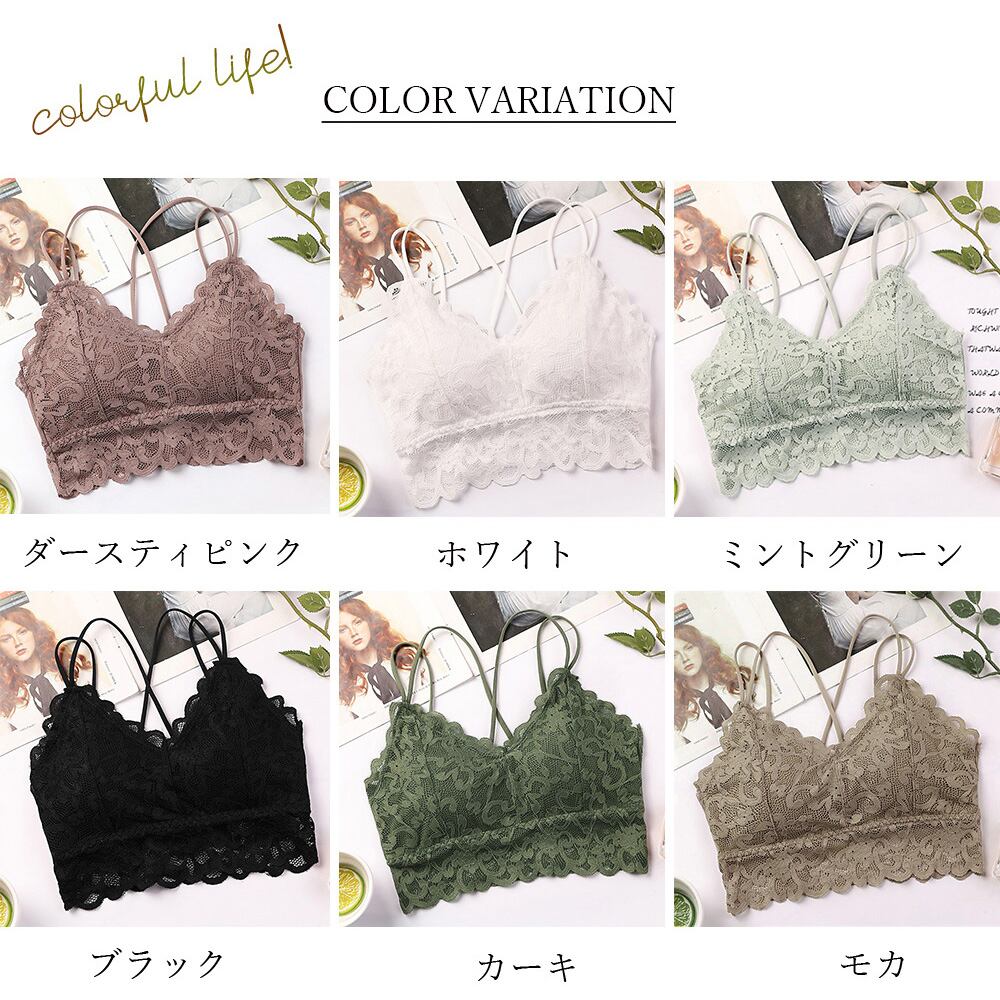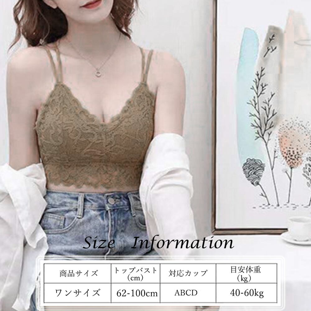 バストを優しく包み込むソフトカップ入り、幅広いシーンで大活躍間違い無しの総レースブラトップです締め付け感のないノンワイヤー仕様。伸縮性に優れた生地が身体に程よくフィットし、ストレス無く着られます細めのバッククロスのコードストラップで、背中が開いたお洋服を着る際にも見えても大丈夫でおすすめですカラー:ブラック/ホワイト/ミントグリーン/ダースティピンク/モカ/カーキ素材:ポリエステル70%+綿30%サイズ:ワンサイズ着丈:約29cm バスト:約62-100cm補正機能:なしワイヤー:なしカップ:ありパッド取り外し:可裏地:なし伸縮性:あり透け感:なし生産国:中国※すべて平置きサイズです(採寸方法違いより、多少の誤差がございますので、ご了承ください)。※海外輸入品のため、商品の細部仕様は予告なく変更になる場合がございます。予めご了承の上、ご注文お願い致します。