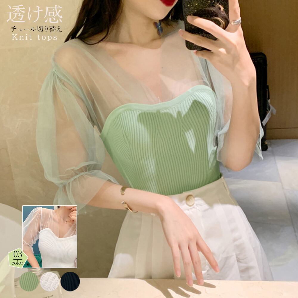 チュールの切り替えでデコルテや背中見せを叶えるリブニットトップスです透け感が華奢見えを演出し、フェミニンな印象に仕上がりますボリューム感のあるボトムスとのコーディネートもバランスよく決まる優秀アイテムカラー:ブラック/ホワイト/ミントグリーン素材:ポリエステル75%+アクリル25%サイズ:ワンサイズ着丈:約53.5cm 肩幅:約35cm 袖丈:約35cm ゆき:約52.5cm 身幅:約29.5cm 胸囲:約59-95cm裏地:なし伸縮性:あり透け感:チュール部分あり/ホワイトのみ若干あり生産国:中国※すべて平置きサイズです(採寸方法違いより、多少の誤差がございますので、ご了承ください)。※海外輸入品のため、商品の細部仕様は予告なく変更になる場合がございます。予めご了承の上、ご注文お願い致します。