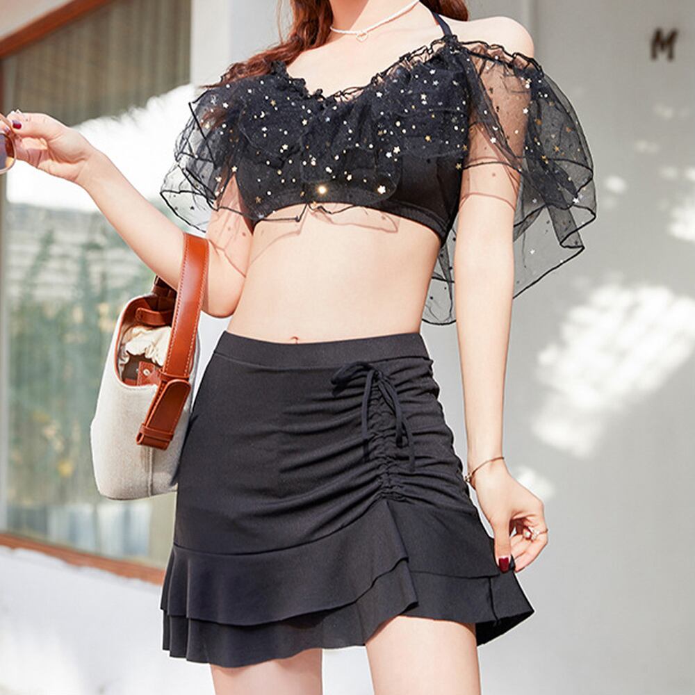 ラメ入りのふんわりフリル付きでバストアップ効果も期待できる水着2点セットホルターネックにオフショルデザイン、背中を大胆に露出、女性らしい華奢さを全面に出すドレスのような美しい水着トップスボトムスはフリルフレアスカート付きのショートパンツ、ボクサータイプなので激しく動いても安心さらにスカートにはレースアップギャザーデザインが加えられ、細部までこだわってフェミニンさを最大限にアピールするカラー:ブラック/ベージュ/グレー素材:ポリエステル85%+ポリウレタン15%サイズ:M/L/XLトップバスト:約64/66/68cmアンダーバスト:約50/52/54cm(ゴム仕様)ウエスト:約52/54/56cm(ゴム仕様)ヒップ:約78/80/82cm商品詳細:・パッド:付き・パッド挿入:可・アンダーバスト調整:可・補正機能:なし・カップ:あり・ワイヤー:なし裏地:なし伸縮性:あり透け感:なし生産国:中国※すべて平置きサイズです(採寸方法違いより、多少の誤差がございますので、ご了承ください)。※海外輸入品のため、商品の細部仕様は予告なく変更になる場合がございます。予めご了承の上、ご注文お願い致します。