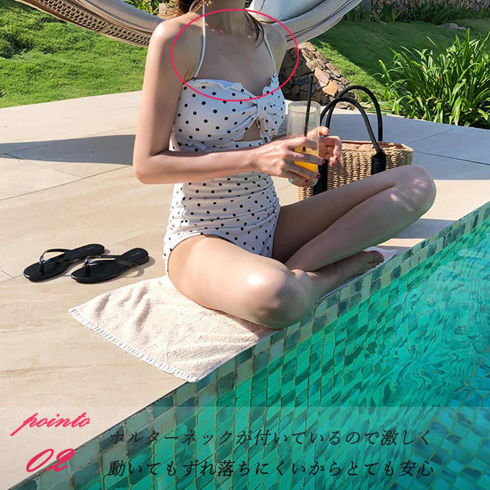 ドット柄 ワンピース 水着 レディース 体型カバー ホルターネック 水着 シンプル モノキニ セクシー ハイウエスト水着 バンドゥ おしゃれママ水着 水着 露出控えめまるで大きなリボンのようなオトナ可愛いドット柄のバンドゥ水着背中にホックが付いているので、ホルターネックでもダブル保険で激しく動いてもずれ落ちにくいからとても安心ハイウエスト仕様で前後とも露出度が控えめ、気になるお腹周りの体型カバーをしてくれるので、プールなどでお子さん連れのママさんでもおススメの水着素材:ポリエステル85%ポリウレタン15%カラー:ホワイトサイズ:M/L/XLトップバスト:約62/66/70cmウエスト:約54/58/62cmヒップ:約68/72/74cm商品詳細:・パッド:付き・パッド挿入:可・アンダーバスト調整:不可・補整機能:なし・カップ:あり・ワイヤー:あり裏地:なし伸縮性:あり透け感:なし生産国:中国※すべて平置きサイズです(採寸方法違いより、多少の誤差がございますので、ご了承ください)。※海外輸入品のため、商品の細部仕様は多少異なる場合がございます。予めご了承の上、ご注文お願い致します。