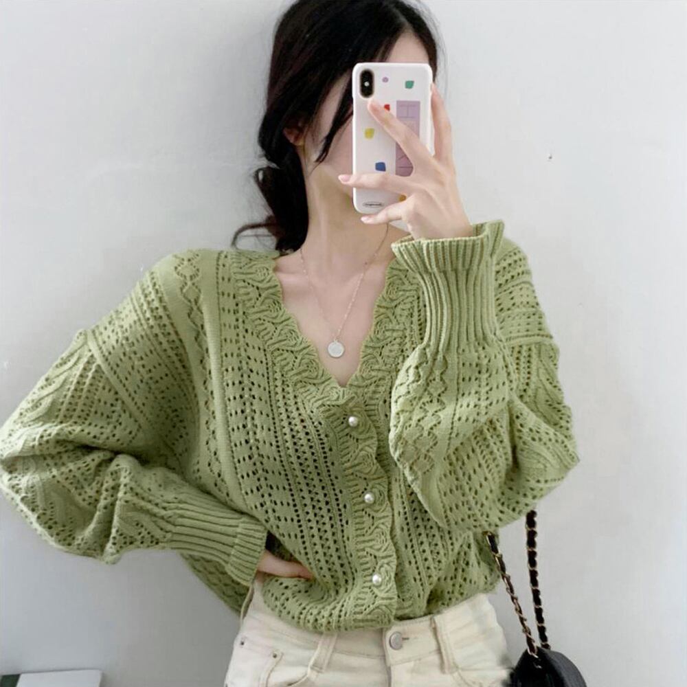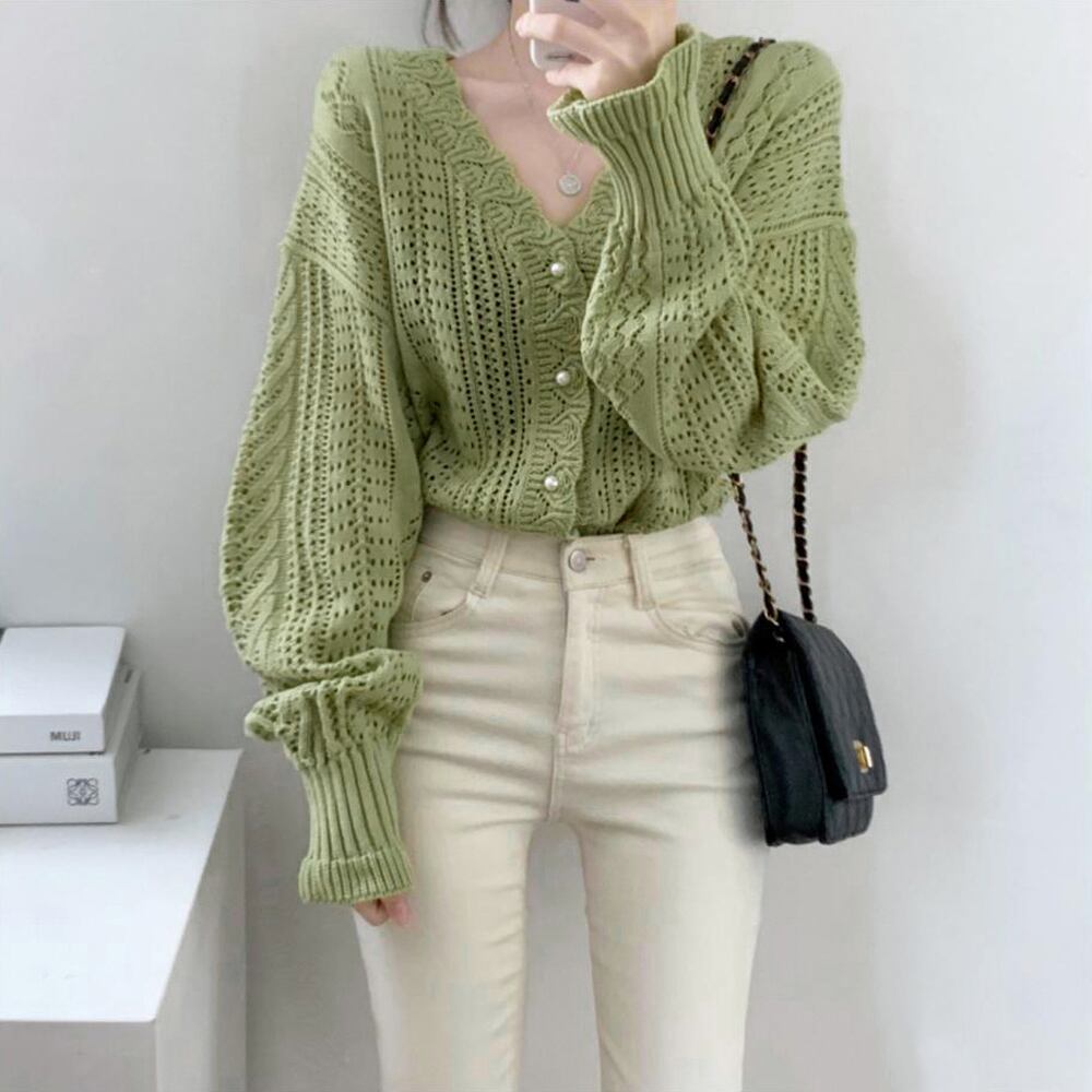 韓国カーディガン Vネック ニット羽織り長袖 パールボタントップス 春秋夏 きれいめカジュアル レトロカーディガン着やせ体型カバーおしゃれ ドロップショルダー 上品清楚軽アウターゆるっとしたシルエットとぽわん袖がトレンド感満載の透かし編みロングスリーブニットカーディガン軽やかで着心地抜群、こだわりの編地がガーリーフェミニンな雰囲気を醸し出す程よい厚みで肌ざわりもよく、ロングシーズン重宝する抜け感とラフ感のあるおしゃれ韓国っぽアイテム素材:アクリル100%カラー:ホワイト/グリーンサイズ:ワンサイズ着丈:約60cm 肩幅:約45cm 袖丈:約50cm ゆき:約72.5cm 身幅:約55cm 胸囲:約110cm裏地:なし伸縮性:あり透け感:あり生産国:中国※すべて平置きサイズです(採寸方法違いより、多少の誤差がございますので、ご了承ください)。※海外輸入品のため、商品の細部仕様は多少異なる場合がございます。予めご了承の上、ご注文お願い致します。