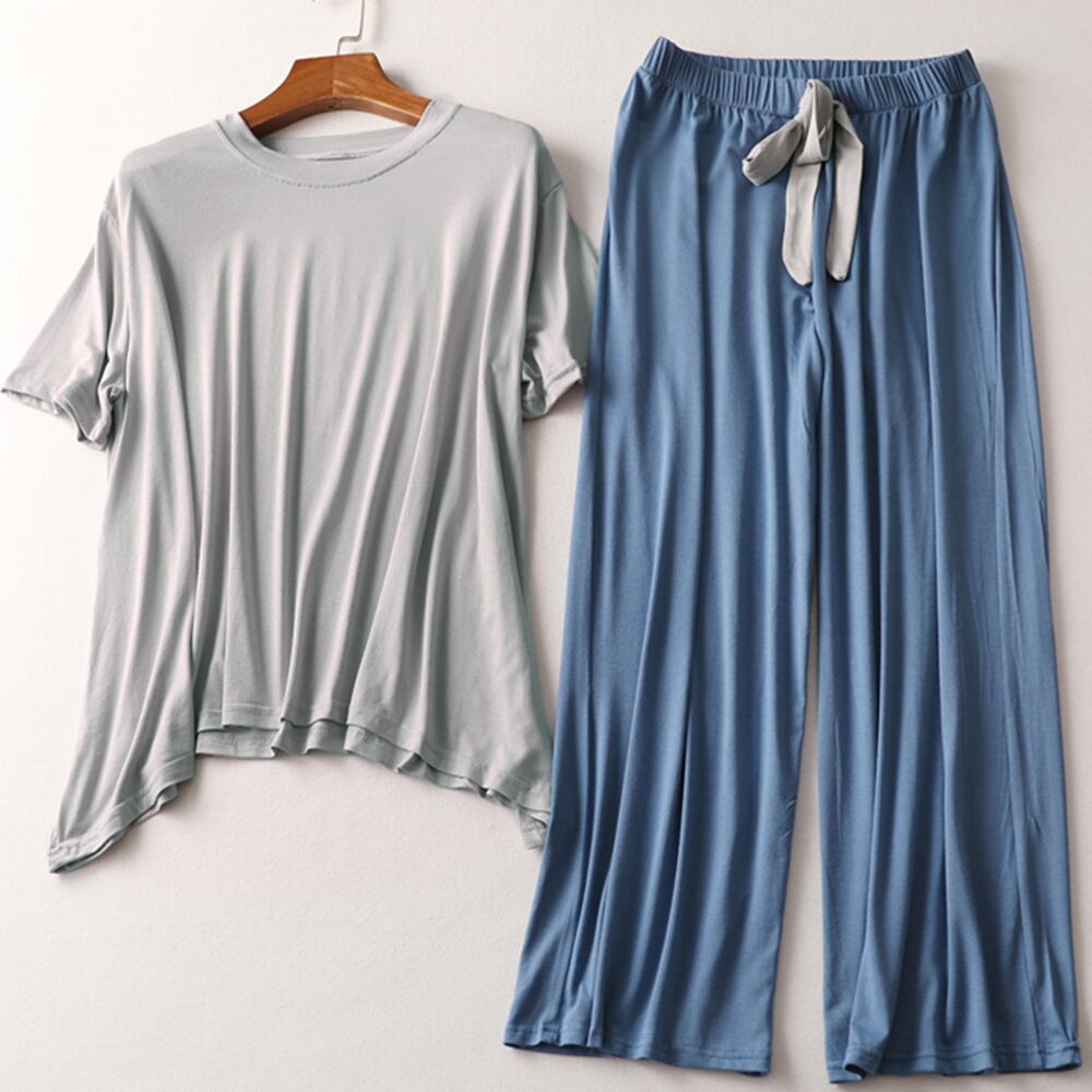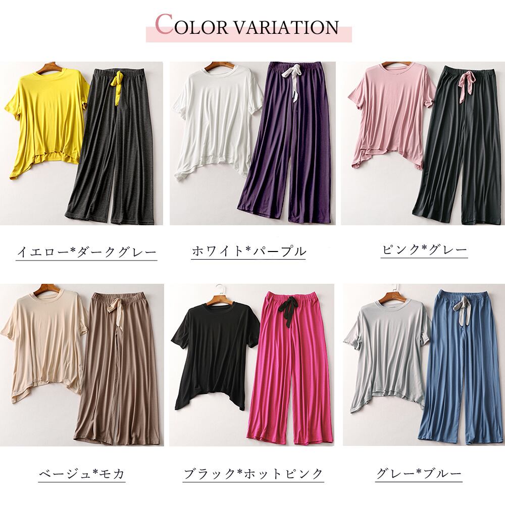 ルームウェア 上下セット レディース パジャマ 2点セット 半袖 部屋着セット ゆったり セットアップ 春夏ロングパンツセット 寝巻き セット トップス セットロングパンツと半袖トップスのルームウェア2点セットですゆったりとしたシルエットで動きやすくラフな着心地を実現し、家にいる時間を快適に過ごせますルームウェアとしてもヨガやスポーツなどでも使っていただけます素材:レーヨン95%+ポリウレタン5%カラー:ブラック*ホットピンク/ホワイト*パープル/イエロー*ダークグレー/グレー*ブルー/ベージュ*モカ/ピンク*グレーサイズ:ワンサイズトップス:着丈:最長約59cm/最短約54cm 肩幅:約43cm 袖丈:約17cm ゆき:約38.5cm 身幅:約52cm 胸囲:約104-134cmボトムス:着丈約84cm 股下:約57cm ウエスト:約60-84cm(ゴム仕様) ヒップ:約100-130cm もも周り:約60-90cm裏地:なし伸縮性:あり透け感:なし生産国:中国※すべて平置きサイズです(採寸方法違いより、多少の誤差がございますので、ご了承ください)。※海外輸入品のため、商品の細部仕様は多少異なる場合がございます。予めご了承の上、ご注文お願い致します。