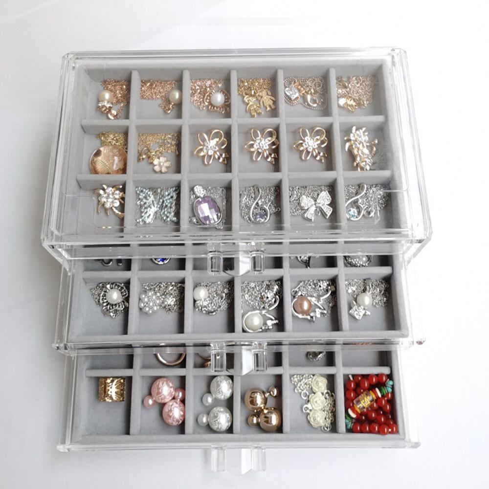 クリアタイプの引き出し式アクセサリー収納ケース3段となっており、中には仕切りももちろんあり整理しやすく、見た目だけでなく使い勝手の良さも見逃せないポイントです。自宅保管用だけでなく、お店の展示用にしたり、プチプラなので気軽にプレゼントとして大事な人に贈ったり、使い方がたくさんある便利なアイテムです。素材:外装-プラスチック/内装-繊維板+起毛素材カラー:グレー本体サイズ:幅約23cm×奥行き約13cm×高さ約10cm重さ:約1184g生産国:中国※すべて平置きサイズです(採寸方法違いより、多少の誤差がございますので、ご了承ください)。※海外輸入品のため、商品の細部仕様は予告なく変更になる場合がございます。予めご了承の上、ご注文お願い致します。