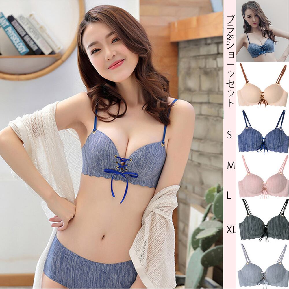 【日本倉庫即納】 ノンワイヤー 三角 ブラジャー ショーツセット ふわ盛りスムース