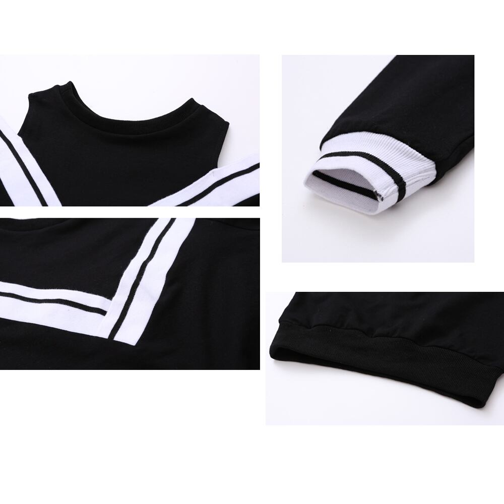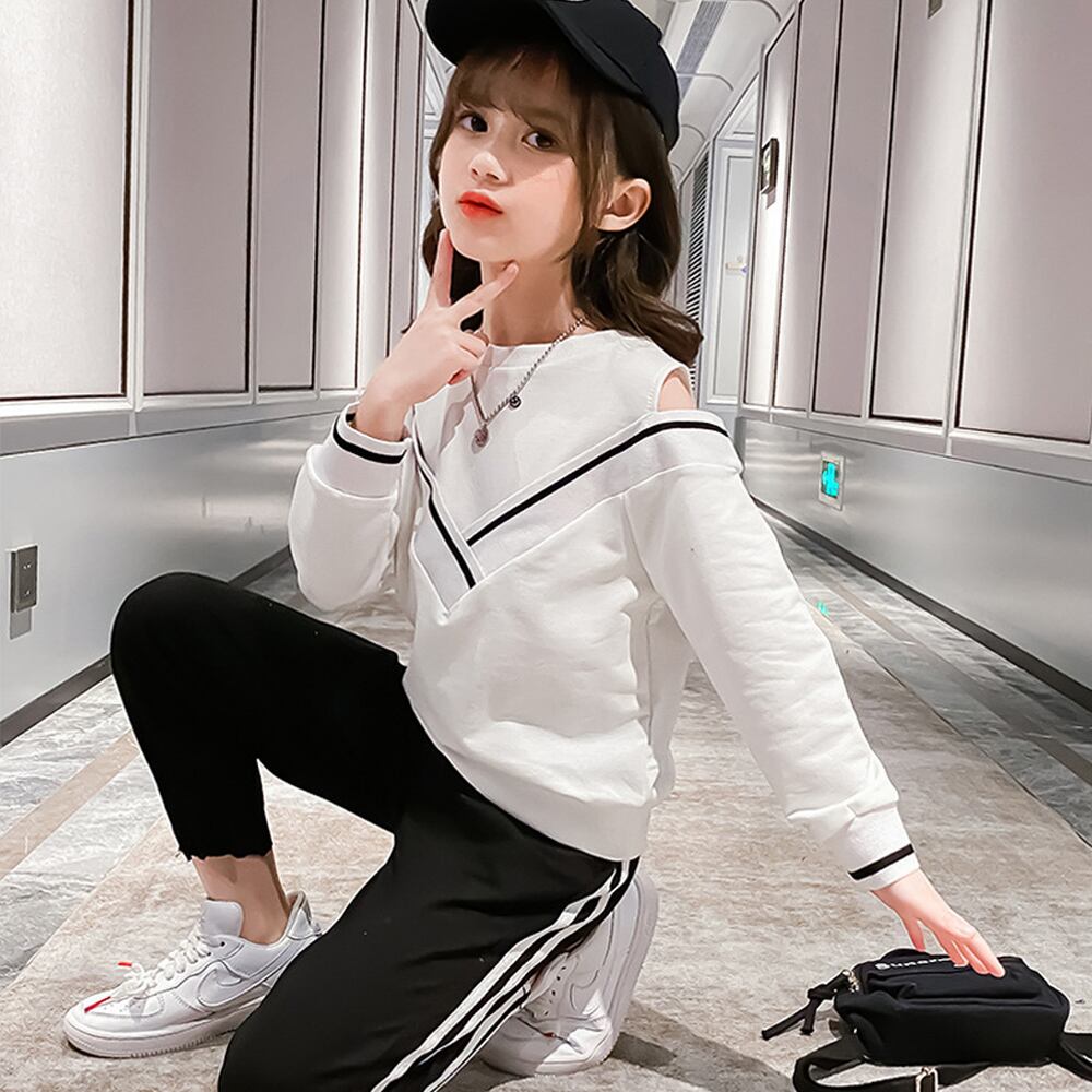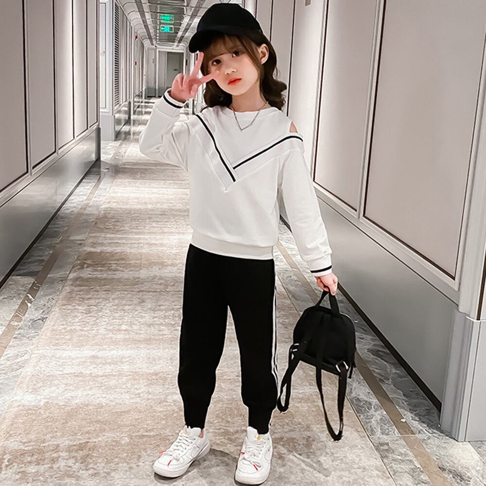 ファッション可愛い肩開き上下2点セットです履きやすく、履き心地も良い、秋大活躍でした。お手持ちの服と合わせるとコーデの幅が広がります♪素材:綿65%+ポリエステル35%カラー:ブラック/ホワイト詳細は下記の「サイズ」を必ずご参考にしてご購入ください。サイズ:120/130/140/150/160【トップス】[120]着丈:約43cm 肩幅:約33cm 袖丈:約36cm胸囲:約70cm[130]着丈:約47cm 肩幅:約36cm 袖丈:約37cm胸囲:約72cm[140]着丈:約51cm 肩幅:約39cm 袖丈:約40cm胸囲:約78cm[150]着丈:約51cm 肩幅:約40cm 袖丈:約42cm胸囲:約80cm[160]着丈:約54cm 肩幅:約41cm 袖丈:約45cm胸囲:約84cm【ボトムス】[120]着丈:約66cm ウエスト(ゴム仕様):約40-50cm 股下:約43cm もも周り:約38cm[130]着丈:約70cm ウエスト(ゴム仕様):約42-52cm 股下:約46cm もも周り:約40cm[140]着丈:約74cm ウエスト(ゴム仕様):約44-56cm 股下:約50cm もも周り:約42cm[150]着丈:約79cm ウエスト(ゴム仕様):約48-60cm 股下:約53cm もも周り:約44cm[160]着丈:約84cm ウエスト(ゴム仕様):約50-60cm 股下:約58cm もも周り:約46cm裏地:なし伸縮性:ややあり透け感:なし生産国:中国※すべて平置きサイズです(採寸方法違いより、多少の誤差がございますので、ご了承ください)。海外輸入品のため、商品の細部仕様は予告なく変更になる場合がございます。予めご了承の上、ご注文お願い致します。