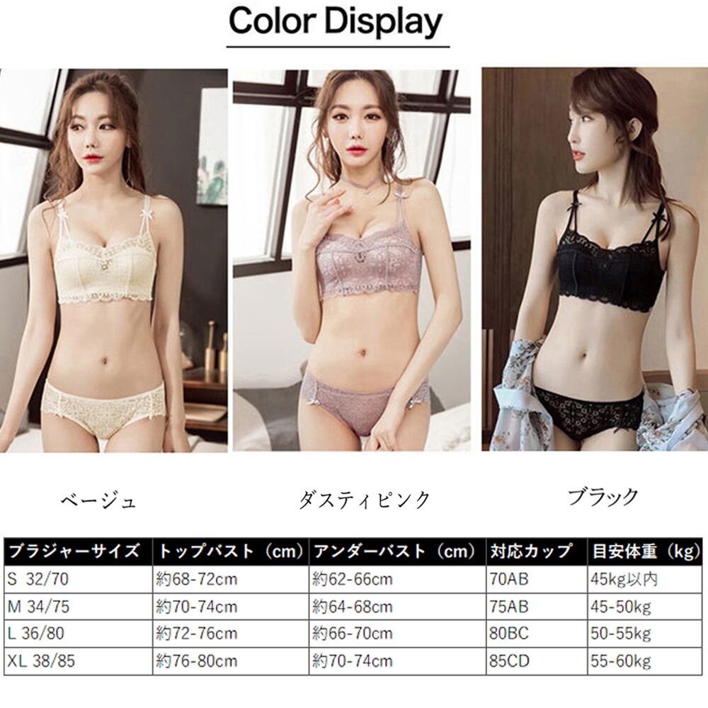 ショーツの透け感大胆かつセクシーなブラショーツセットワイヤーなしでも胸を優しく寄せ上げ、自然な盛り感とふんわりした谷間をメイク背中を綺麗に魅せて、女性らしさが漂う素材:ナイロン80%+ポリウレタン20%カラー:ブラック/ベージュ/ダスティピンク●サイズブラジャー:[S]32/70 70AB トップバスト:約68-72cm アンダーバスト:約62-66cm[M]34/75 75AB トップバスト:約70-74cm アンダーバスト:約64-68cm[L]36/80 80BC トップバスト:約72-76cm アンダーバスト:約66-70cm[XL]38/85 85CD トップバスト:約76-80cm アンダーバスト:約70-74cmショーツ:[S]股上:約18cm ウエスト:約54-74cm ヒップ:約70cm[M]股上:約18cm ウエスト:約54-74cm ヒップ:約70cm[L]股上:約18cm ウエスト:約58-78cm ヒップ:約72cm[XL]股上:約18cm ウエスト:約60-80cm ヒップ:約76cm●仕様3/4カップ、ホック3列4段階調節、肩紐取外し不可、ワイヤー:なし●効果谷間づくり、ボリュームUP補正機能:なしワイヤー:なしカップ:あり裏地:なし伸縮性:あり透け感:ブラジャーアンダーの部分あり/ショーツあり生産国:中国※すべて平置きサイズです(採寸方法違いより、多少の誤差がございますので、ご了承ください)。※海外輸入品のため、商品の細部仕様は予告なく変更になる場合がございます。予めご了承の上、ご注文お願い致します。