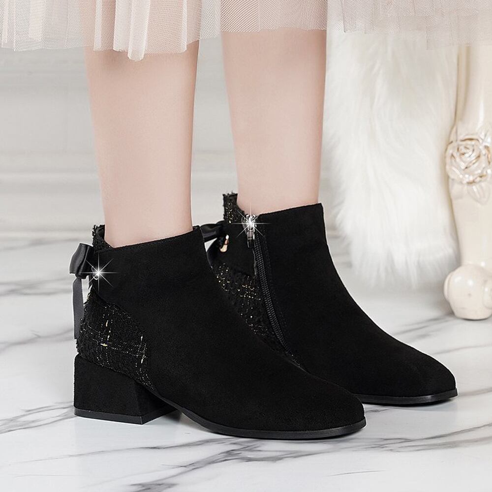 とってもレディなスエード調ショートブーツ大人気の太めヒールは安定感があり、後ろリボン付き、キレイに見せてくれ、歩きやすさも美しさも兼ね備えた生地をたっぷり使ったスカートはもちろん、タイトなマキシスカートや、スキニーデニムと合わせてもクールです。甲素材:合成繊維底素材:合成底カラー:ブラックサイズ:22.5cm/23.0cm/23.5cm/24.0cm/24.5cm[22.5]長さ:約22.5cm 幅:約7.6cm ヒール:約4.5cm[23.0]長さ:約23.0cm 幅:約7.7cm ヒール:約4.5cm[23.5]長さ:約23.5cm 幅:約7.8cm ヒール:約4.5cm[24.0]長さ:約24.0cm 幅:約7.9cm ヒール:約4.5cm[24.5]長さ:約24.5cm 幅:約8.0cm ヒール:約4.5cm[24.5]長さ:約24.5cm 幅:約8.1cm ヒール:約4.5cm[25.0]長さ:約24.5cm 幅:約8.2cm ヒール:約4.5cm重さ(両足):約709g-760g生産国:中国※すべて平置きサイズです(採寸方法違いより、多少の誤差がございますので、ご了承ください)。※商品は縫製上の細かいほつれ、汚れ、接着剤が残り、素材特有の臭いや接着剤等の臭いが残っている場合がございます。ご了承ください。※海外輸入品のため、商品の細部仕様は予告なく変更になる場合がございます。予めご了承の上、ご注文お願い致します。