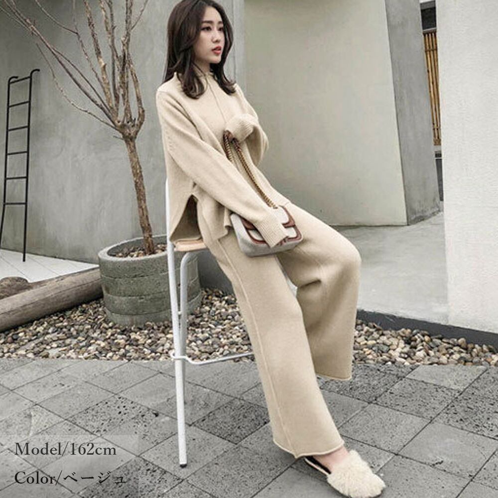 【日本倉庫即納】 ニットセットアップ レディース ゆったり 秋冬長袖 ニットトップス 無地