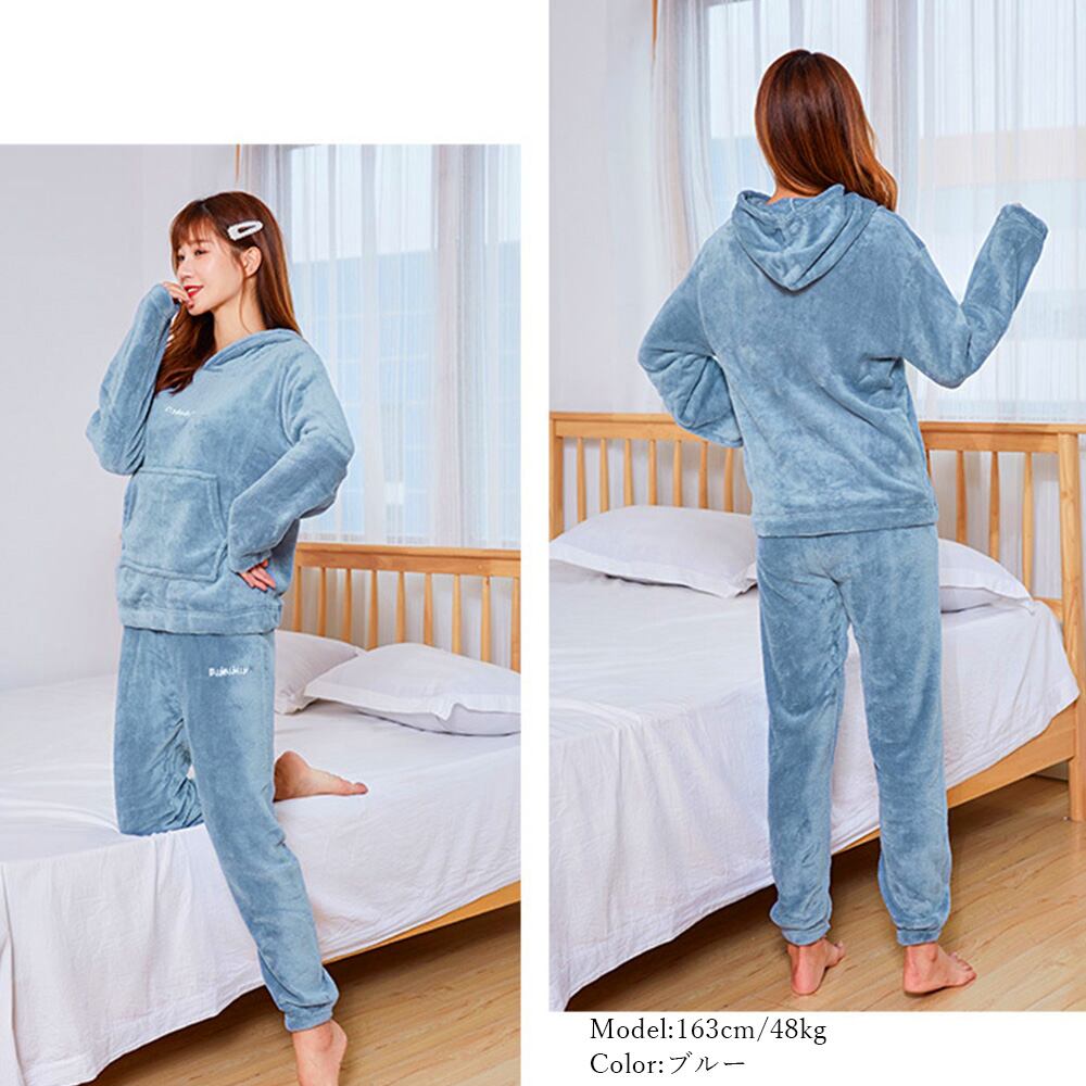 モコモコ パジャマ 上下セット 長袖 刺しゅう入り 冬ふんわり、しっかり暖かいフリース素材のルームウェアセットアップフード付きのパーカータイプで暖かく可愛い、これからの季節にぴったり袖口とボトム裾口にゴム仕様が加工のデザインで家事も便利素材:ポリエステル100%カラー:ブラック/ホワイト/ダークグレー/テラコッタ/ブルー/ピンク/モカサイズ:ワンサイズトップス:着丈:約63cm 肩幅:約54cm 袖丈:約54cm ゆき:約81cm 身幅:約58cm 胸囲:約116cmボトムス:着丈:約98cm 股下:約65cm ウエスト:約64-98cm(ゴム仕様) ヒップ:約106cm もも周り:約60cm裏地:なし伸縮性:なし透け感:なし生産国:中国※すべて平置きサイズです(採寸方法違いより、多少の誤差がございますので、ご了承ください)。※海外輸入品のため、商品の細部仕様は多少異なる場合がございます。予めご了承の上、ご注文お願い致します。