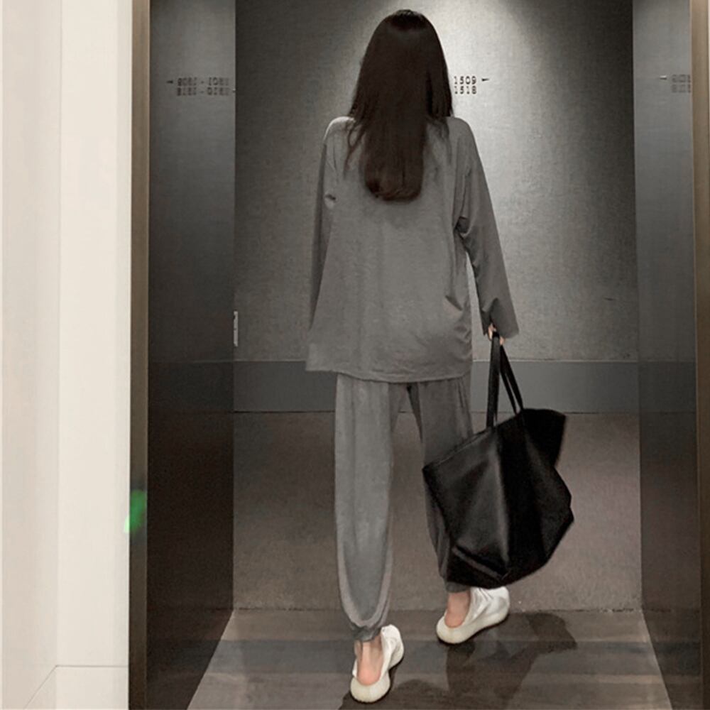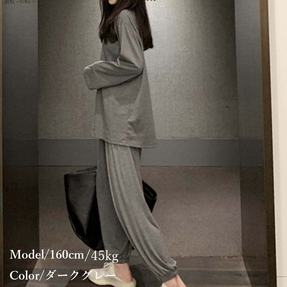 ほどよい伸縮性があるので着心地の良いルームウェア2点セット肌触りの良い柔らかな風合いが特徴半袖を着るにはちょっと肌寒いなという時にオススメ素材:綿30%+ポリエステル70%カラー:ダークグレーサイズ:ワンサイズ(L)トップス:着丈:約65cm 肩幅:約50cm 袖丈:約51cm ゆき:約76cm 身幅:約56cm 胸囲:約112-130cmボトムス:着丈:約93cm 股下:約62cm ウエスト(ゴム仕様):約60-94cm ヒップ:約98-130cm もも周り:約58cm裏地:なし伸縮性:あり透け感:なし生産国:中国※すべて平置きサイズです(採寸方法違いより、多少の誤差がございますので、ご了承ください)。※海外輸入品のため、商品の細部仕様は予告なく変更になる場合がございます。予めご了承の上、ご注文お願い致します。