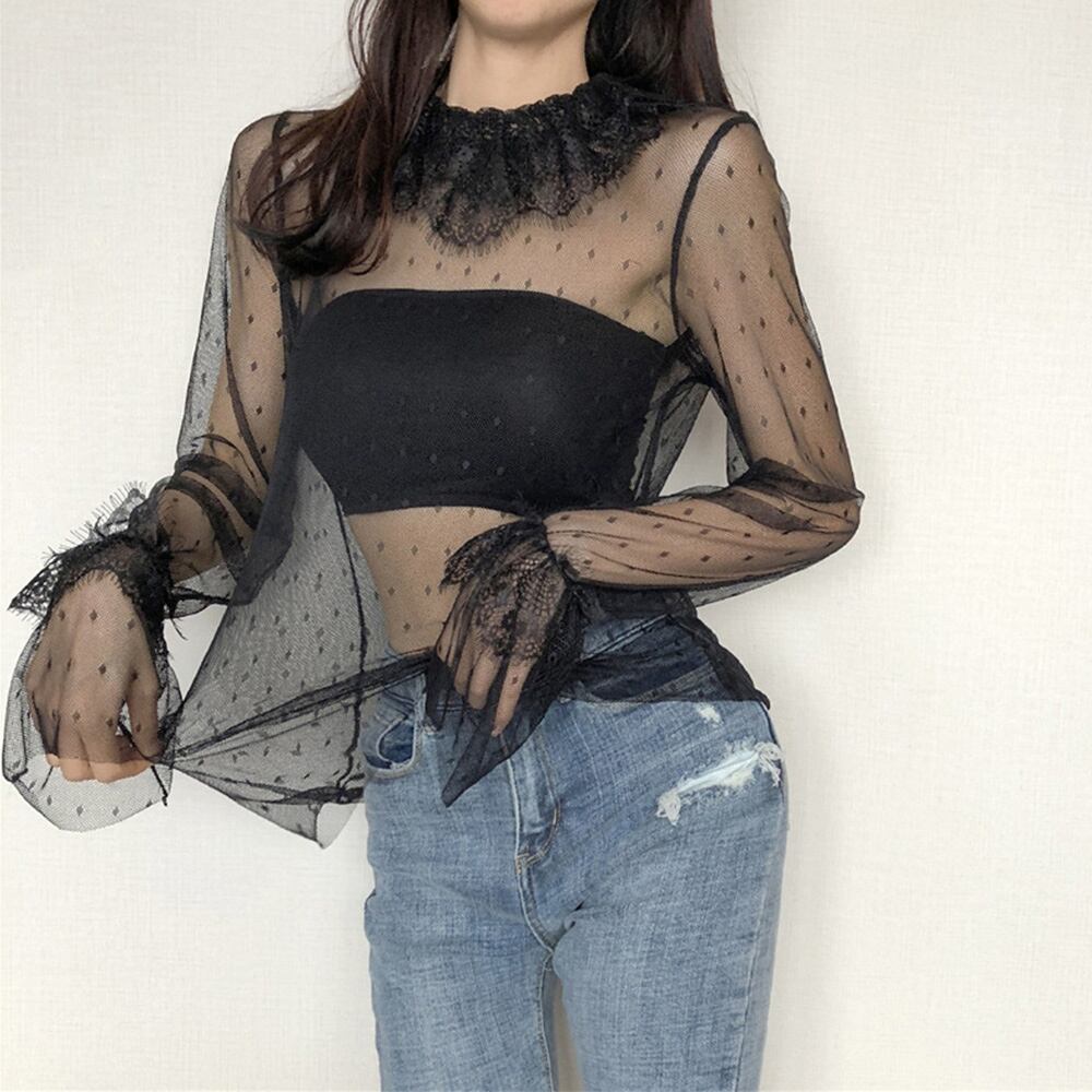 【日本倉庫即納】 シアーブラウス レディース レーストップス 透け感 フレアスリーブ シースルー
