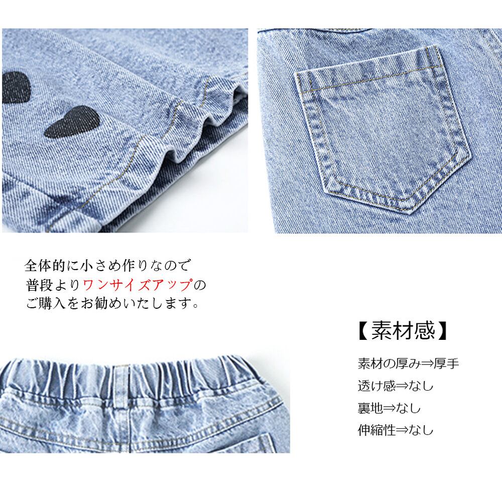 キッズ 新作 柄プリント パンツ 韓国子供 ファッション ジュニア ボトムス 小学生 大人気子供ジーパン 子供服 通学着 韓国服パンツズボンカジュアルなおしゃれな女の子用デニムショートパンツ♪左右ハート柄入ったデザインが大人っぽくキマる♪両サイドポケット付き、ウエストゴムでお着替えラクチン!Tシャツなどに合わせれば、お洒落コーデの完成!素材:綿65%+ポリエステル35%カラー:デニムブルー※詳細は下記の「サイズ」を必ずご参考にしてご購入ください。※普段よりワンサイズアップをおススメ致します。サイズ:120/130/140/150/160[120]着丈:約32cm 股下:約6cm ウエスト:約40-50cm(ゴム仕様) ヒップ:約72cm もも周り:約48cm[130]着丈:約33cm 股下:約6cm ウエスト:約42-52cm(ゴム仕様) ヒップ:約76cm もも周り:約50cm[140]着丈:約34cm 股下:約6cm ウエスト約44-54cm(ゴム仕様) ヒップ:約80cm もも周り:約52cm[150]着丈:約35cm 股下:約7cm ウエスト約46-56cm(ゴム仕様) ヒップ:約84cm もも周り:約54cm[160]着丈:約36cm 股下:約7cm ウエスト約46-56cm(ゴム仕様) ヒップ:約88cm もも周り:約56cm裏地:なし伸縮性:なし透け感:なし生産国:中国※すべて平置きサイズです(採寸方法違いより、多少の誤差がございますので、ご了承ください)。※海外輸入品のため、商品の細部仕様は多少異なる場合がございます。予めご了承の上、ご注文お願い致します。