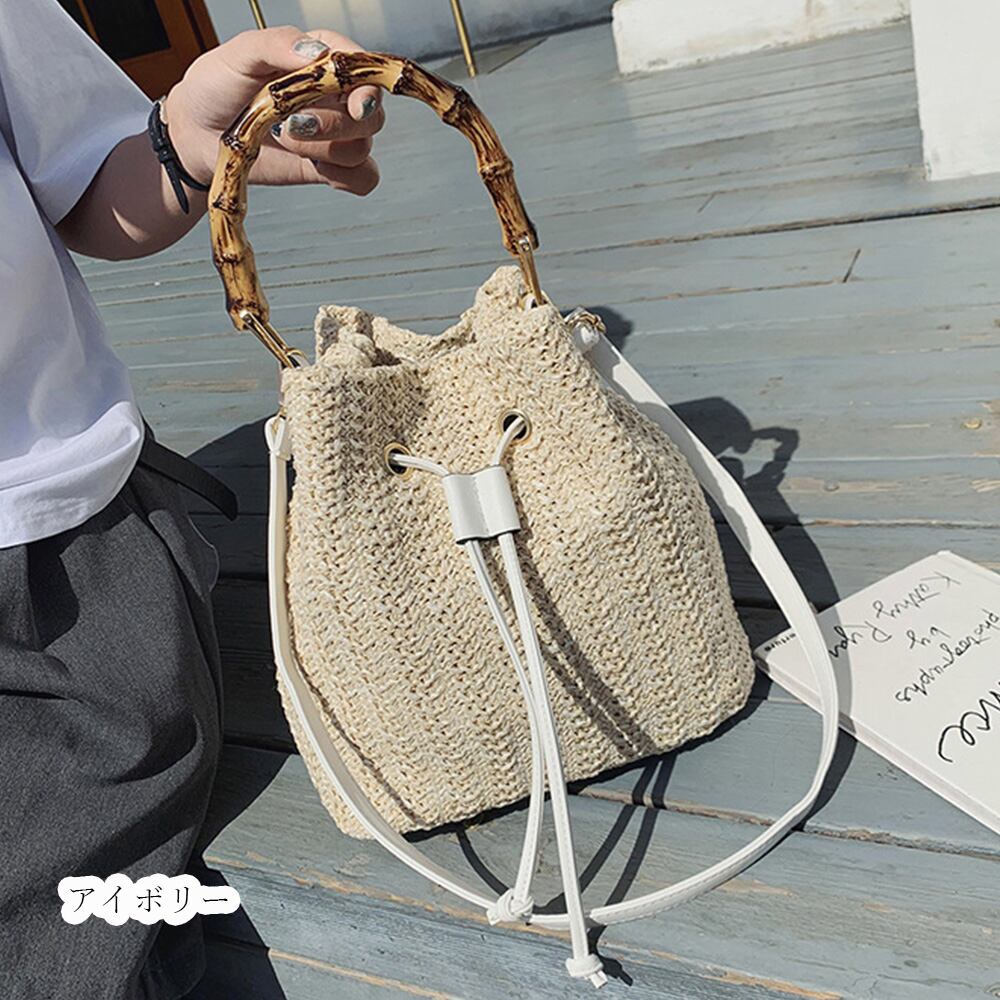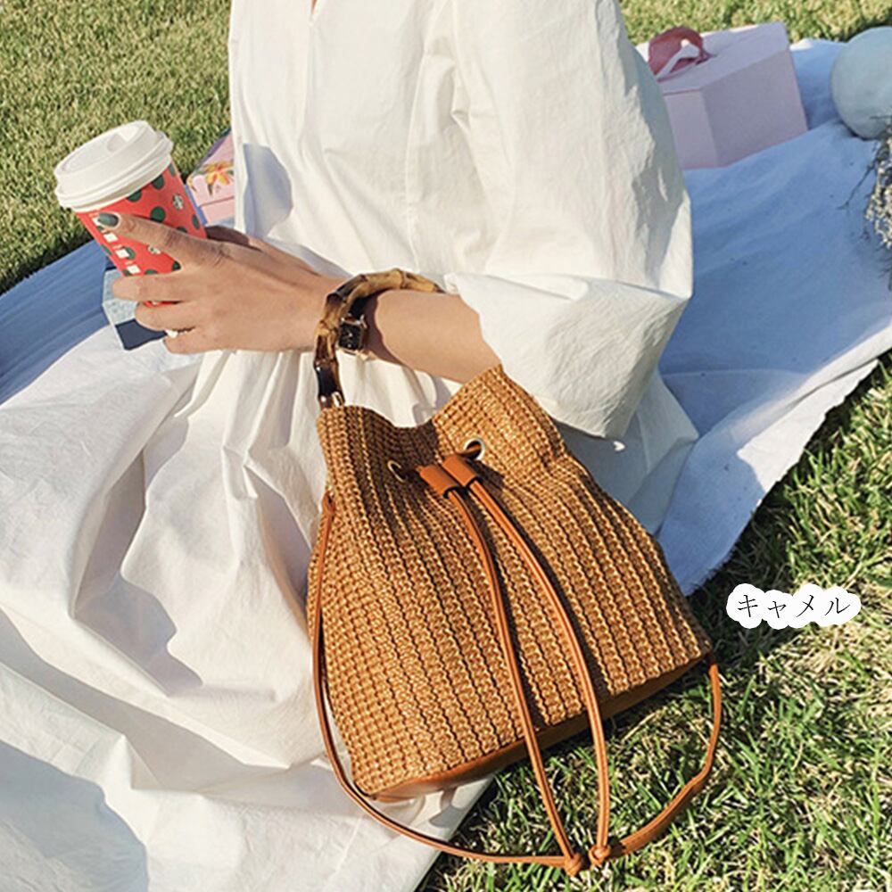 ショルダー 夏 レディース 編み 籠バッグ 斜めかけ ナチュラル ペーパー 遠足 ストローバッグ バケット鞄 旅行 おでかけ 肩掛け涼しげに編まれたナチュラル素材の2way仕様巾着かごバッグバンブーの持ち手とストロー素材が季節感をプラスショルダーは取り外し可能で、ハンドバッグとしても使える、上部の調節紐を引っ張ると巾着型になる、大人スタイルに合う様クラス感を演出したこだわりカジュアルスタイルは勿論、フェミニン、上品と幅広く使いまわせる優秀アイテム素材:ペーパー+ポリエステルカラー:ベージュ/アイボリー/キャメルサイズ:高さ:約26cm 底横幅:約24cm マチ:約14cm 持ち手:約36cm(調節不可、取り外し不可) ショルダー:約60-120cm(調節可、取り外し可)重さ:約441g裏地:あり内ポケット:あり生産国:中国※すべて平置きサイズです(採寸方法違いより、多少の誤差がございますので、ご了承ください)。※海外輸入品のため、商品の細部仕様は多少異なる場合がございます。生産期間により、色違いの編み方も異なりますので、予めご了承の上、ご注文お願い致します。