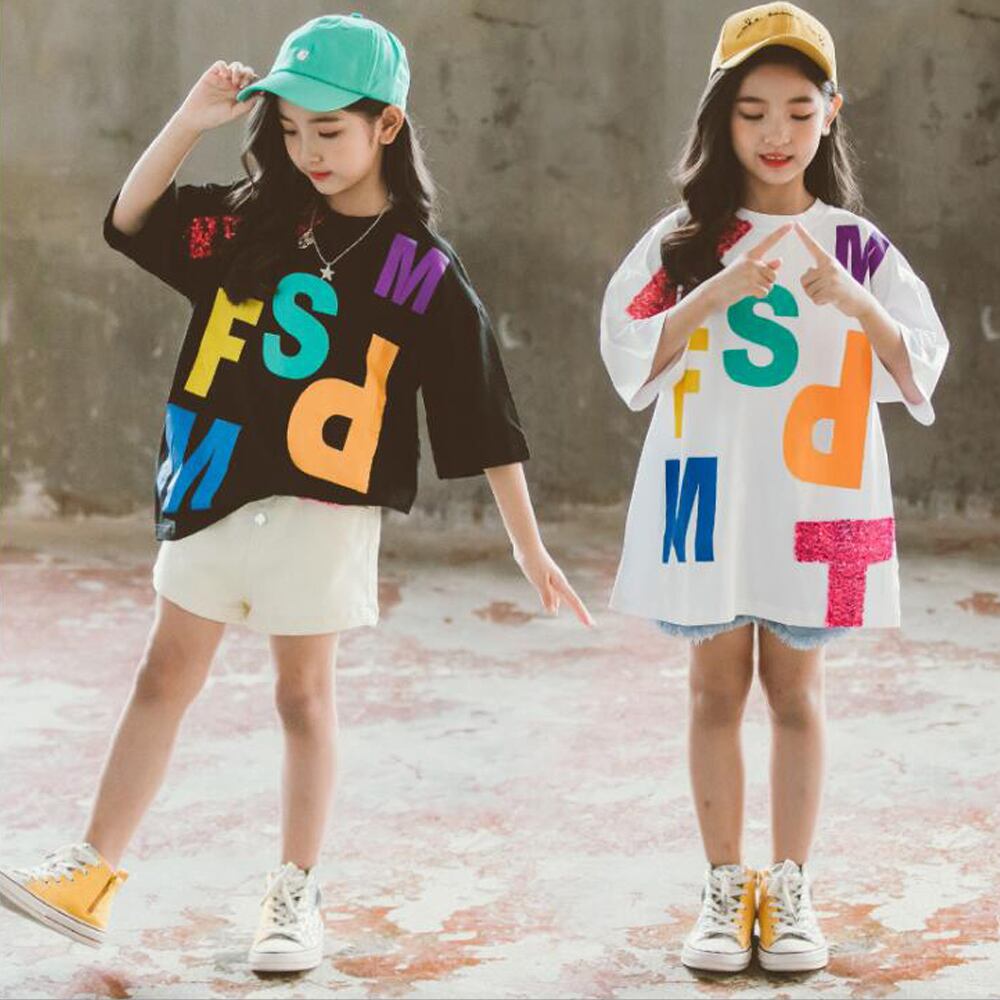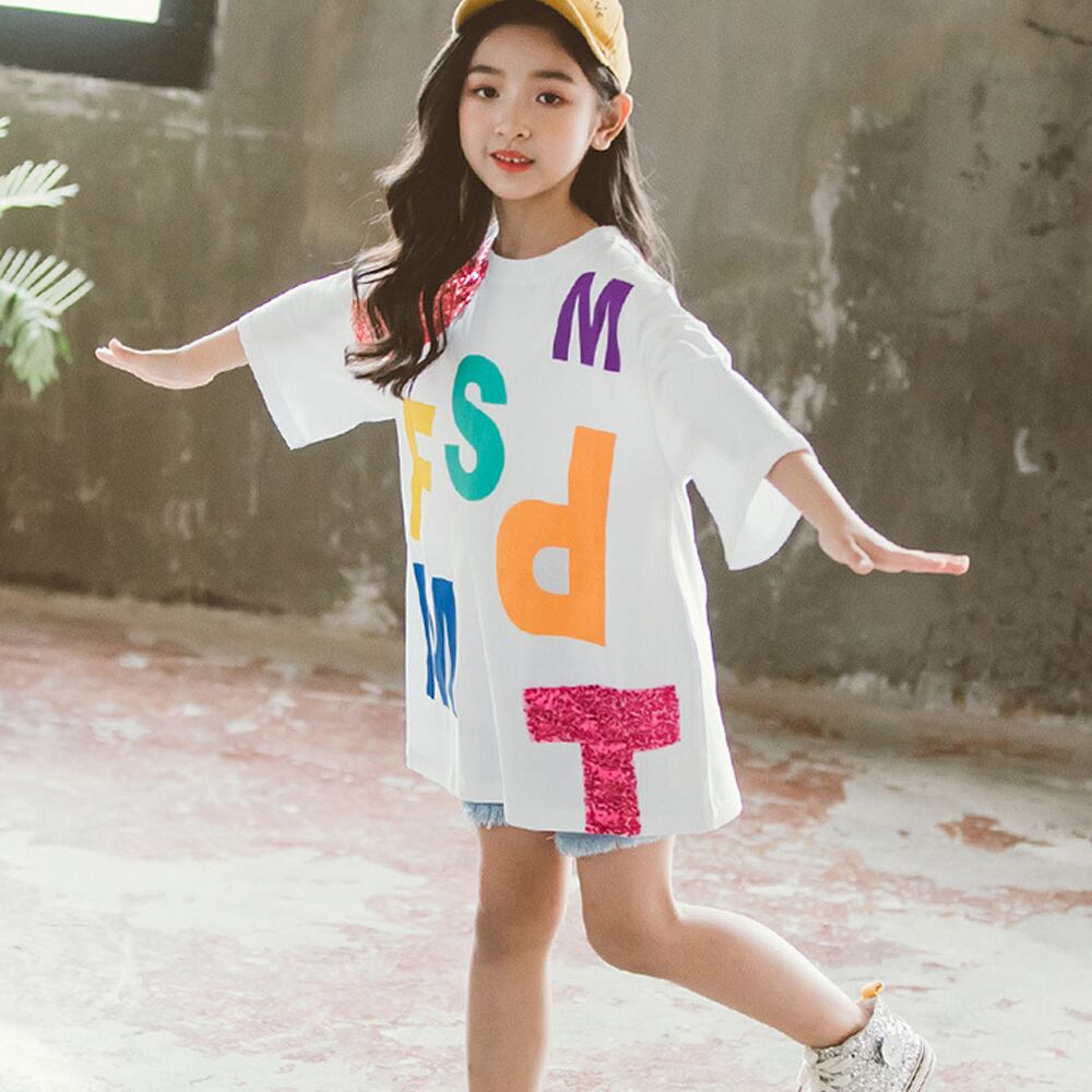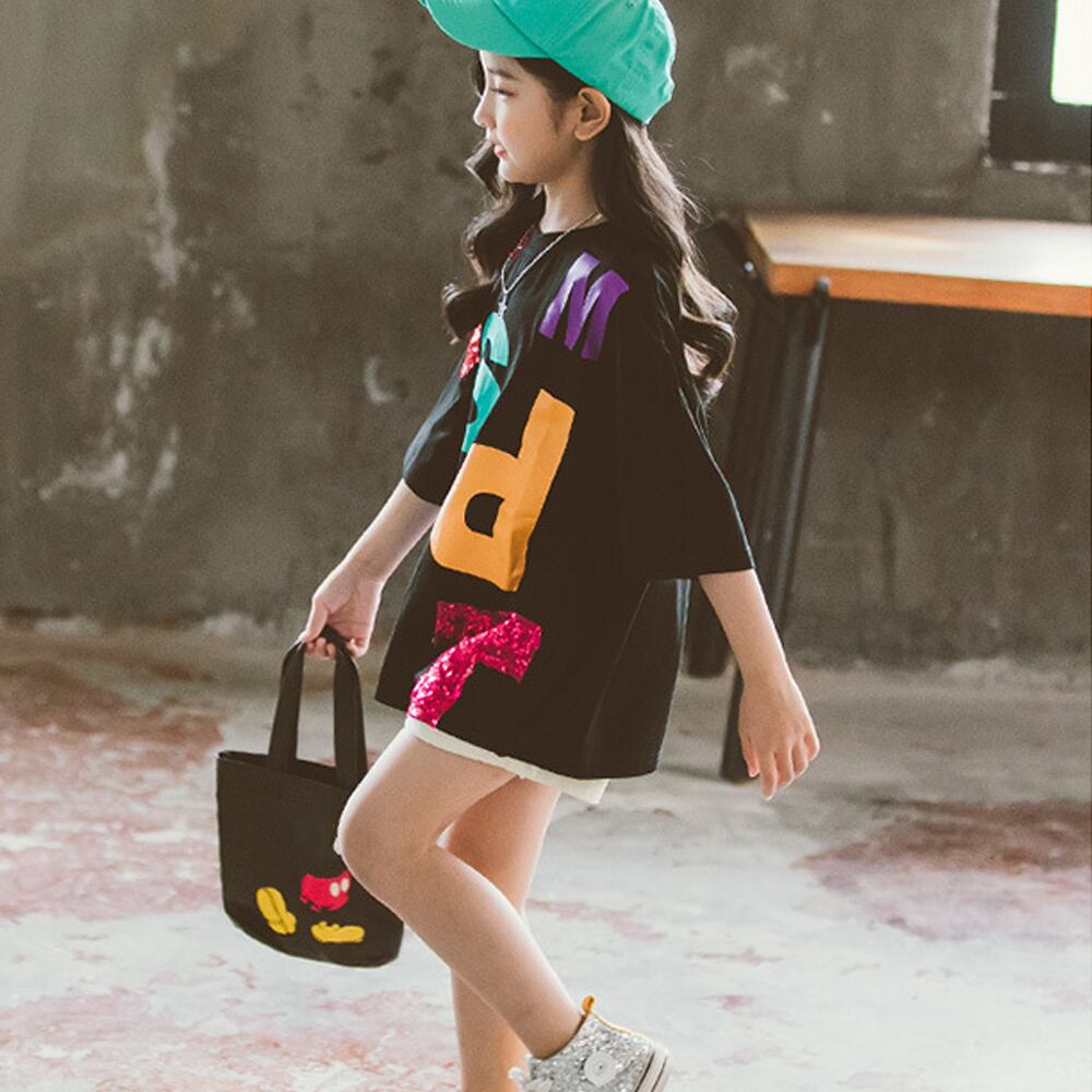 子供服 ロンT 女の子 ガールズ キラキラ 英字柄 Tシャツワンピース ジュニア 半袖 韓国風 トップス ロング カジュアル 姉妹 双子 お揃い子供用ゆったり着られるオーバーサイズのロンTです。シャツはもちろんワンピースとしても着用できる2way仕様もポイントです。英字柄デザイン女の子らしい、雰囲気なので可愛くてオススメします。♪お手持ちのショートパンツやスキニーパンツと合わせるとコーデの幅が広がります。素材:綿65%+ポリエステル35%カラー:ブラック/ホワイト※詳細は下記の「サイズ」を必ずご参考にしてご購入ください。サイズ:120/130/130/140/150/160[120]着丈:約55cm 肩幅:約41cm 袖丈:約19cm ゆき:約39.5cm 身幅:約39cm 胸囲:約78cm[130]着丈:約59cm 肩幅:約43cm 袖丈:約19cm ゆき:約40.5cm 身幅:約41cm 胸囲:約82cm[140]着丈:約63cm 肩幅:約45cm 袖丈:約20cm ゆき:約42.5cm 身幅:約43cm 胸囲:約86cm[150]着丈:約67cm 肩幅:約47cm 袖丈:約20cm ゆき:約43.5cm 身幅:約45cm 胸囲:約90cm[160]着丈:約71cm 肩幅:約49cm 袖丈:約22cm ゆき:約46.5cm 身幅:約47cm 胸囲:約94cm裏地:なし伸縮性:あり透け感:ホワイトのみややあり生産国:中国※すべて平置きサイズです(採寸方法違いより、多少の誤差がございますので、ご了承ください)。※海外輸入品のため、商品の細部仕様は多少異なる場合がございます。予めご了承の上、ご注文お願い致します。